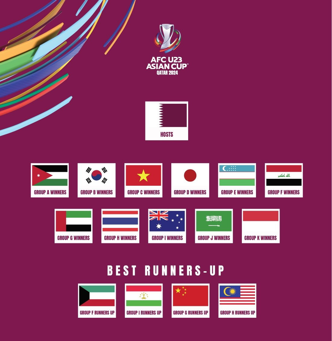 Đội đầu bảng: U23 Jordan (bảng A), U23 Hàn Quốc (B), U23 Việt Nam (C), U23 Nhật Bản (D), U23 Uzbekistan (E), U23 Iraq (F), U23 UAE (G), U23 Thái Lan (H), U23 Australia (I), U23 Saudi Arabia (J), U23 Indonesia (K)