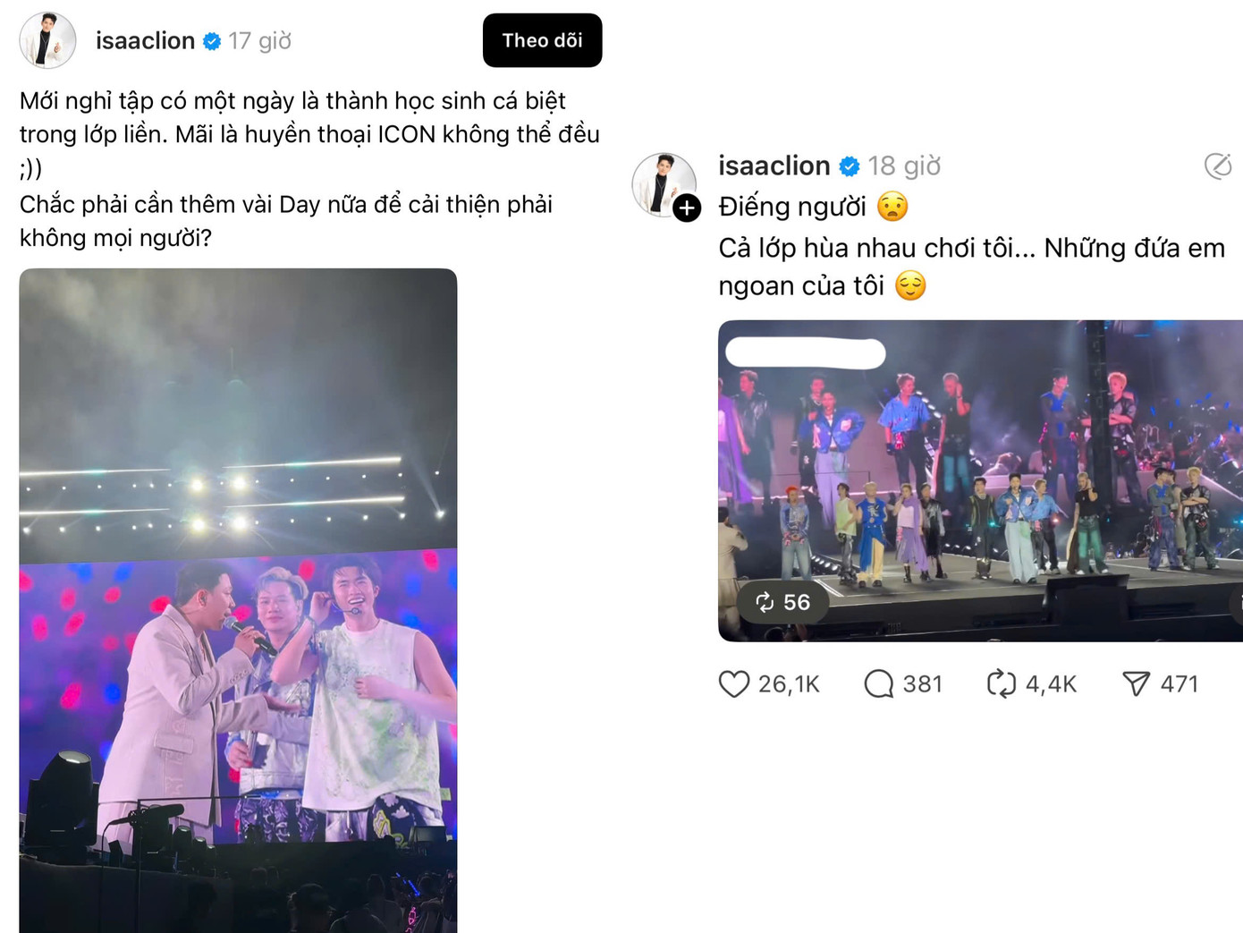 Cộng đồng mạng có một pha bật cười trước loạt bài đăng của Isaac trên Threads, nơi nam ca sĩ dành cả buổi sáng để than phiền về một pha bị "chơi khăm" ngay trên sân khấu concert ATSH D-5. Không chỉ bày tỏ sự tổn thương khi phát hiện các Anh trai có một nhóm chat bí mật mà mình không hề hay biết, cựu thành viên 365daband còn tuyên bố sẽ không vắng mặt trong bất kỳ buổi tập nào sắp tới, nhằm tránh lặp lại "cú lừa" này thêm một lần nữa.