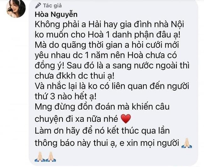 Mới đây nhất, Hòa Minzy tiếp tục khẳng định việc chưa đám cưới và đăng ký kết hôn là vì cô chưa đồng ý. Cô cho biết: "Không phải anh Hải hay gia đình nhà nội không muốn cho Hòa một danh phận, mà do quãng thời gian anh hỏi cưới mới yêu nhau được 1 năm nên Hòa chưa đồng ý. Sau đó là anh sang nước ngoài thì không thay đổi tình trạng hôn nhân trong hồ sơ được nên không đăng ký kết hôn thôi ạ. Và nhắc lại là không có liên quan đến người thứ 3 nào hết ạ. Mọi người đừng đồn đoán mà khiến câu chuyện đi xa hơn nữa nhé."