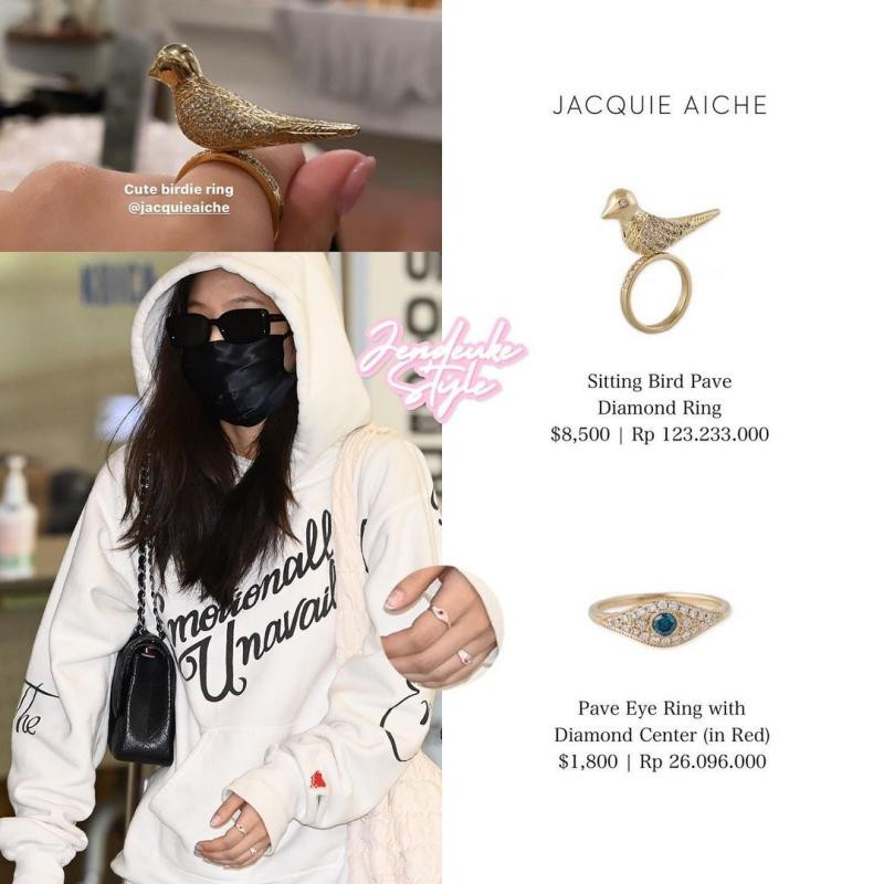 Jennie không chỉ dùng một món đồ này của Jacquie Aiche, hôm ở sân bay, netizen cũng phát hiện ra Jennie đeo 2 chiếc nhẫn của thương hiệu này, mỗi chiếc có giá lên tới hơn 41 triệu đồng.