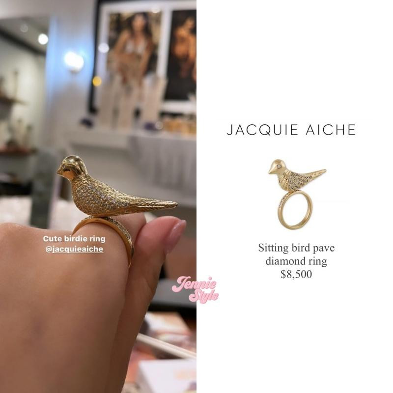 Đặc biệt, trong những ngày ở Mỹ, Jennie còn từng đăng một story khoe chiếc nhẫn hình con chim rất độc đáo, và tag hẳn tài khoản Instagram của thương hiệu này trong story của cô, chiếc nhẫn này có giá cực khủng, lên tới hơn 195 triệu đồng, được làm từ vàng và đính kim cương quanh thân chú chim.