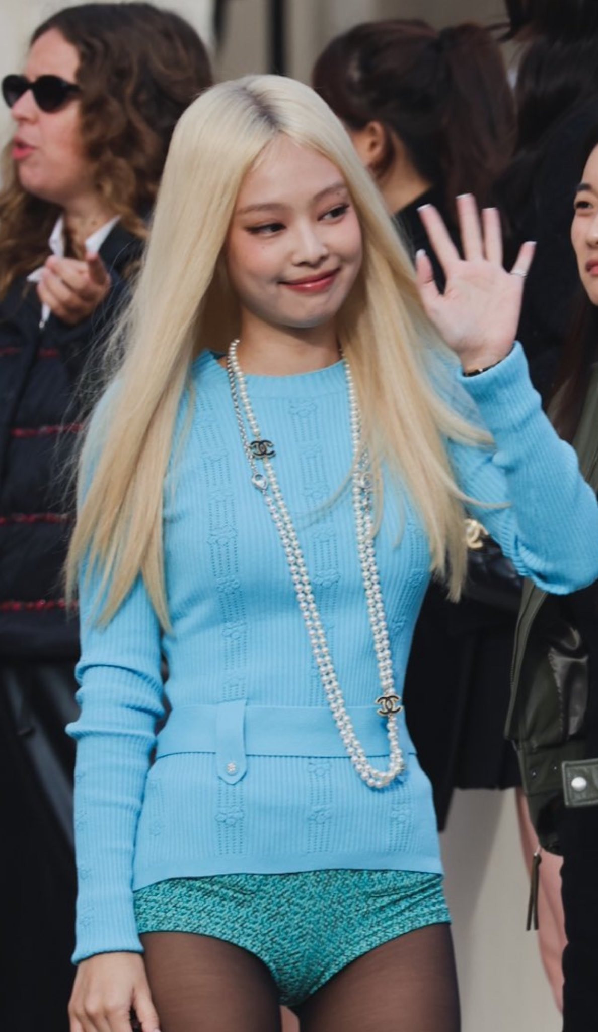 Jennie xuất hiện với mái tóc bạch kim nổi bật khi dự show của Chanel thuộc Tuần lễ thời trang Paris 2024. Cô diện áo len mỏng dài tay bó sát, kết hợp cùng quần siêu ngắn, phụ kiện đi kèm là chuỗi ngọc trai bắt mắt.