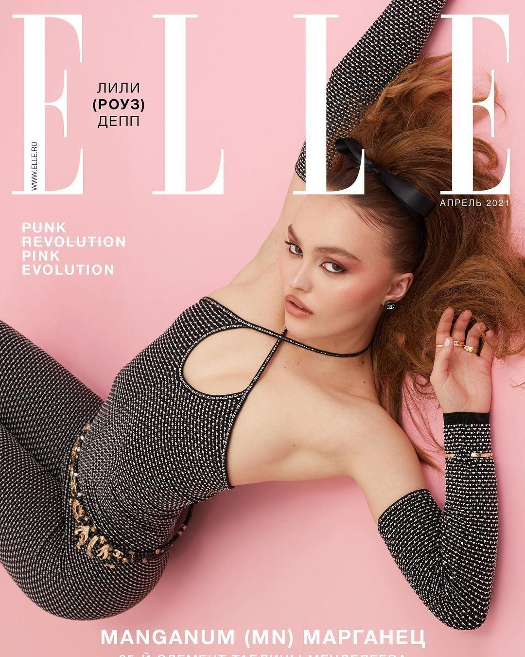 Một đại sứ khác của Chanel là Lily-Rose Depp xuất hiện trên bìa ELLE Nga cũng số tháng 4 với bộ trang phục y chang. Không giống như Jennie, Lily có phong cách tạo dáng cá tính và quyến rũ sắc sảo của người mẫu phương Tây.