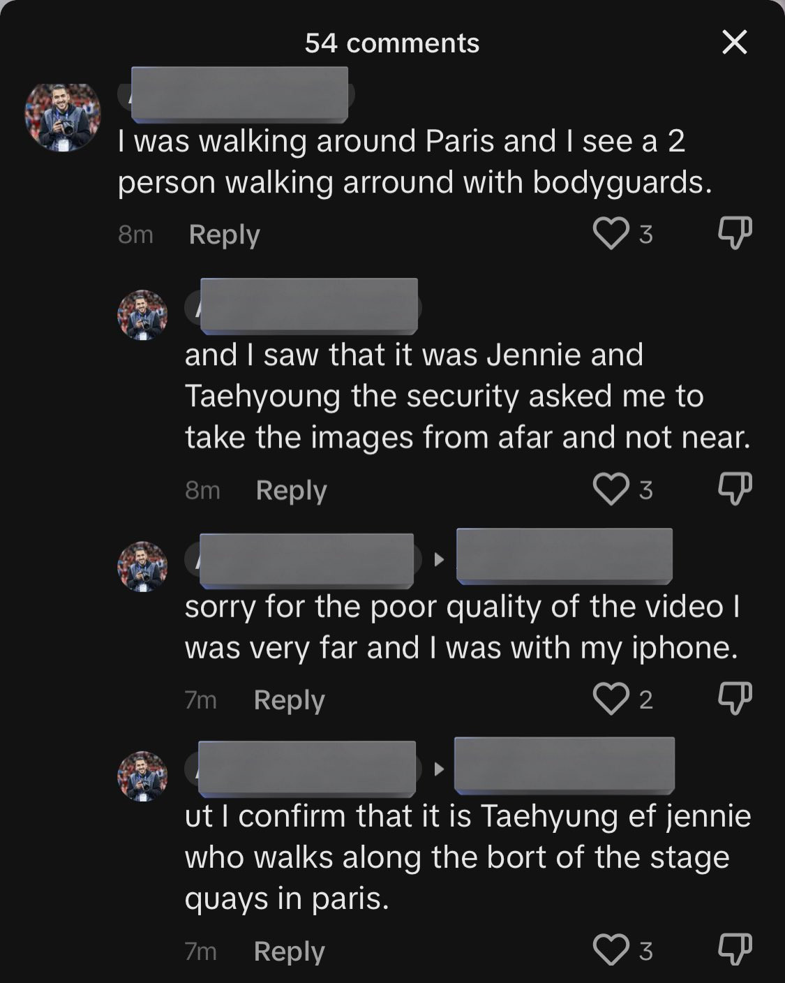 Cư dân mạng này đã bắt gặp một cặp đôi đang đi dạo từ xa, khẳng định chính là Jennie và V. Cả hai đi dạo cùng nhau và có vệ sĩ xung quanh.
