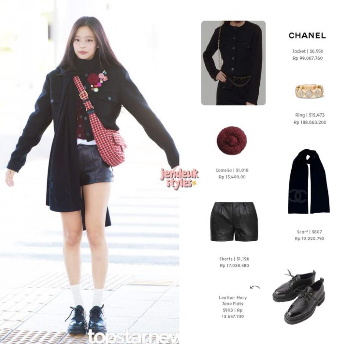 Điểm nhấn của trang phục nằm ở chiếc túi đeo chéo hình bán nguyệt bằng vải tweed, cài hoa trà đỏ "cộp mác" thương hiệu Chanel. Jennie hoàn thiện vẻ ngoài trẻ trung với đôi giày oxford, kiểu trang điểm, làm tóc đơn giản. Tính "sương sương", tạo hình của nữ đại sứ toàn cầu thương hiệu Chanel có giá trị khoảng 22.877 USD (hơn 562 triệu đồng).