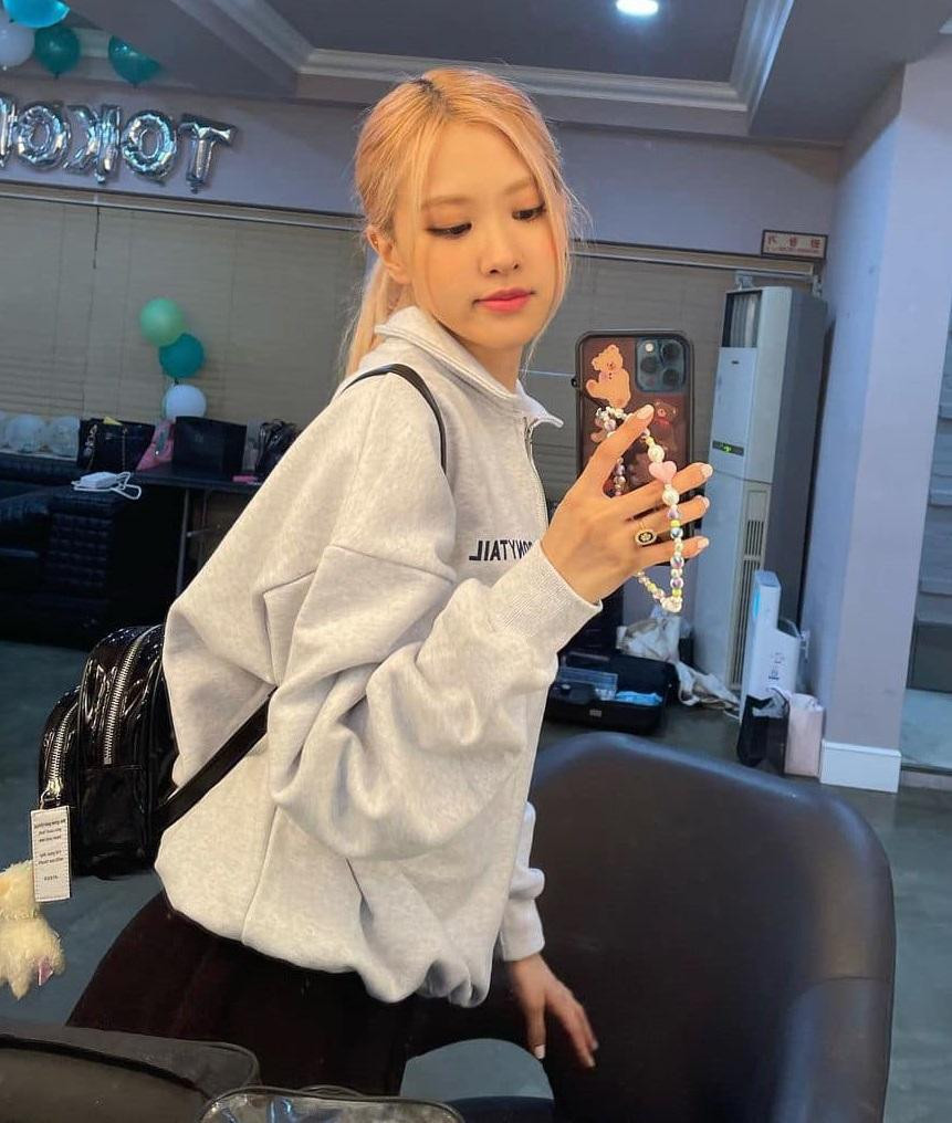 Vài hôm sau, đến lượt Rosé khoe style trẻ trung cùng chiếc ba lô da bóng màu đen sau lưng. Rosé còn đeo thêm móc khóa gấu bông cho thêm phần ku-te.