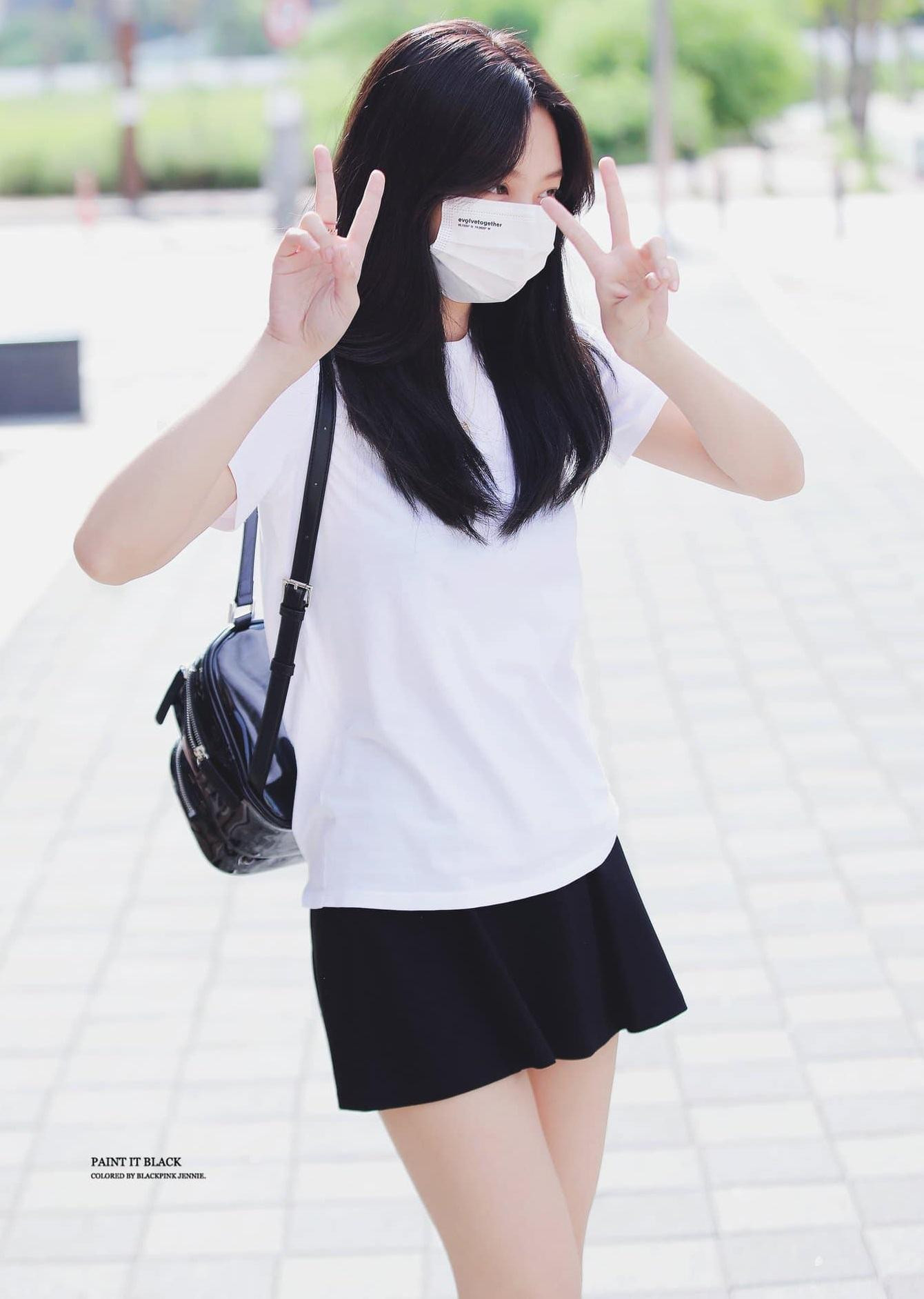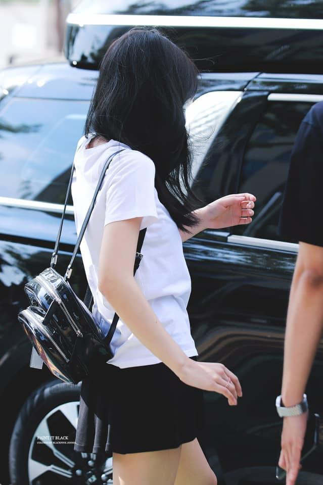 Áo thun trắng giản đơn, chân váy đen, đeo balo nhí nhảnh và thả tóc xõa là đủ để Jennie hack tuổi thần kỳ.