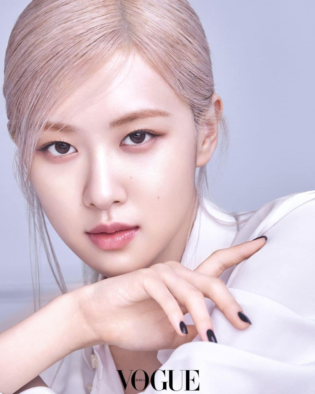 Rosé vừa mới chụp bộ ảnh giới thiệu mỹ phẩm Saint Laurent đăng trên tạp chí Vogue Hàn Quốc. Cô búi tóc đơn giản, trang điểm nhẹ nhàng, trang phục chỉ là sơ mi trắng cổ điển để làm nổi bật chai serum dưỡng đêm đang cầm trên tay.
