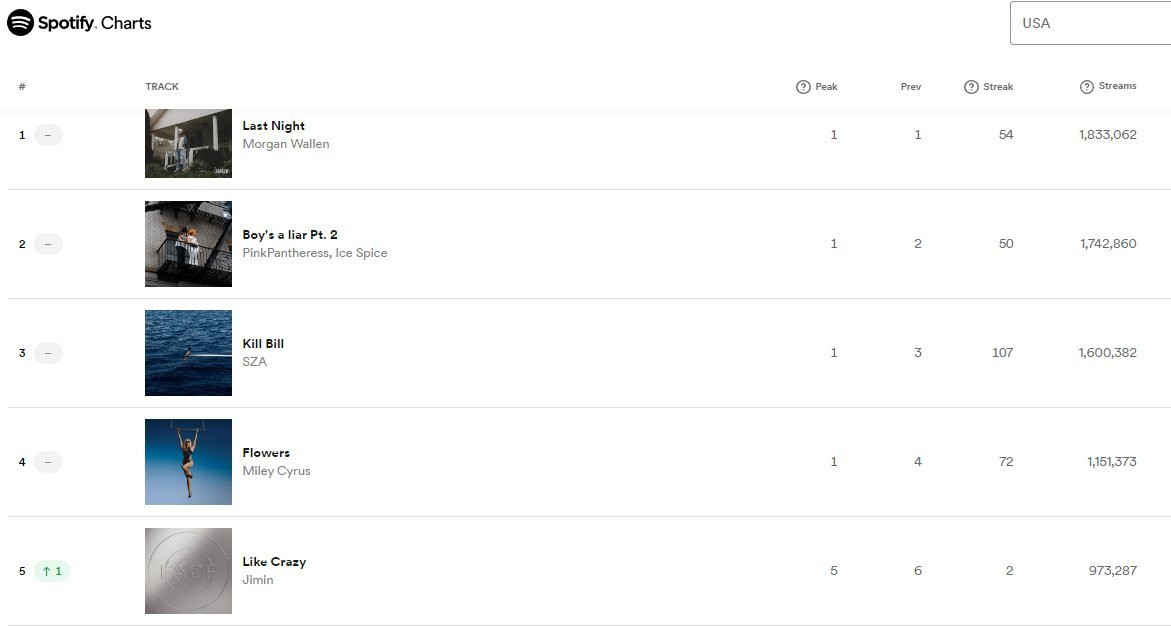 | Với 6.013.972 lượt stream tại ngày thứ 3, Like Crazy nhảy vọt lên dẫn đầu BXH Spotify toàn cầu. |