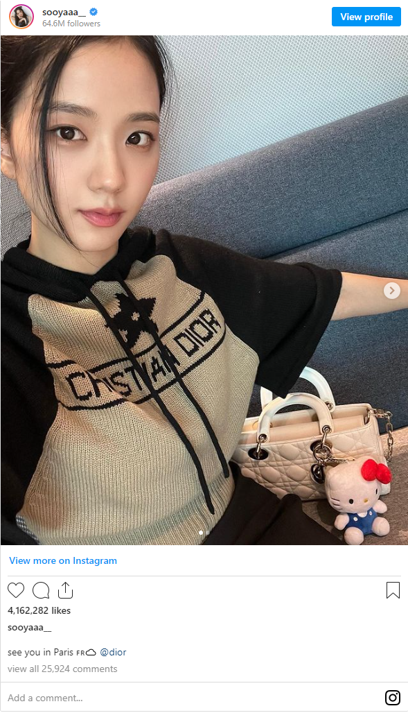Hai ngày trước, Jisoo đã hé lộ trên Instagram về sự xuất hiện này khi mặc chiếc áo len của nhà mốt Dior và hẹn gặp người hâm mộ ở Paris.