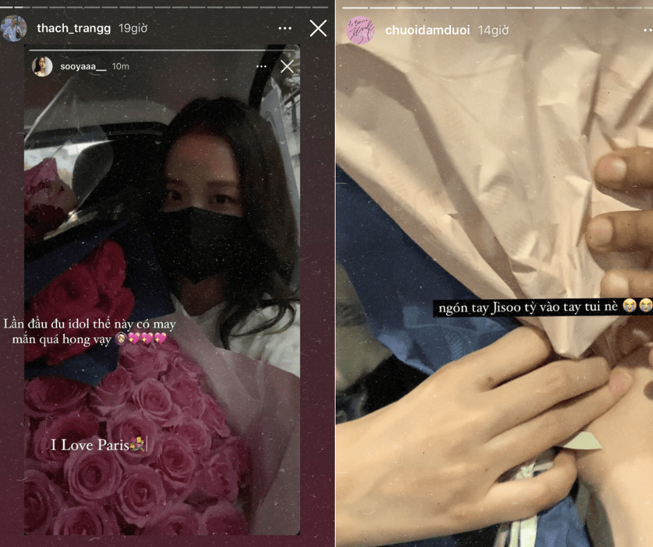 Trong thời gian Jisoo và Rosé đến Paris (Pháp) để tham dự Tuần lễ Thời trang Paris 2022, có 2 fan Việt đã đến đón mừng và tặng hoa cho 2 cô gái. Sau đó, quà tặng của 2 người hâm mộ này còn được chủ nhân ca khúc FLOWER khoe lên Story Instagram.