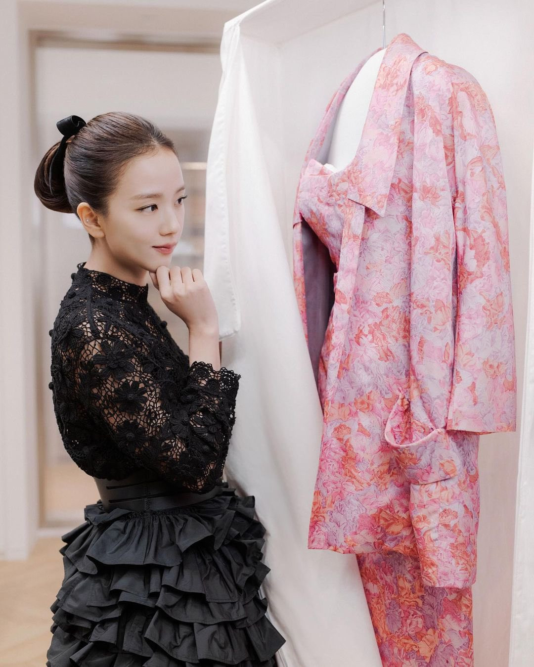 Jisoo dành niềm yêu thích đặc biệt cho hoa linh lan. Đây cũng là loài hoa mang ý nghĩa quan trọng với Dior. Vì vậy, nàng Đại sứ đã được xem một chiếc váy có sử dụng bản in là loài hoa này.