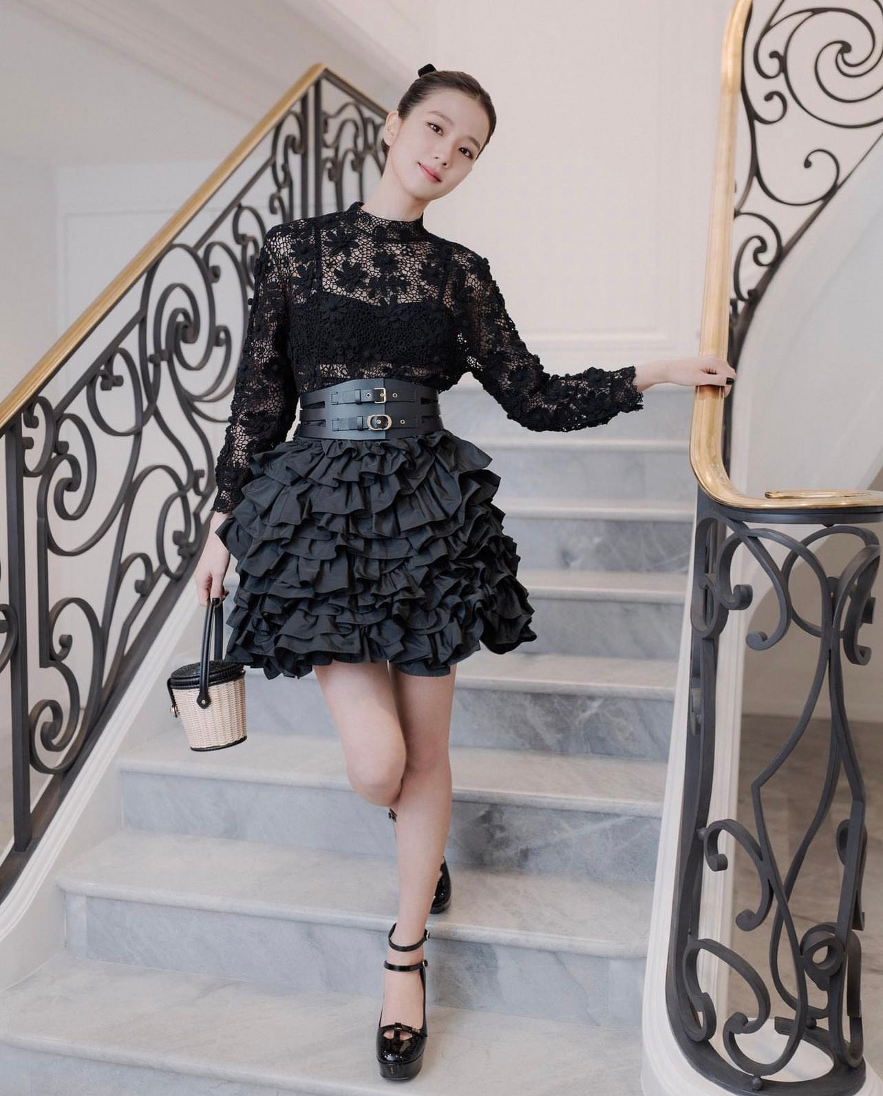 Jisoo diện chiếc váy ren đen toát lên khí chất của một quý cô sang trọng, thanh lịch đúng với phong cách của Dior. Không để buông mái tóc dài được ép thẳng hay uốn nhẹ quen thuộc, Jisoo lần này được tạo kiểu tóc búi sau đầu đậm chất cổ điển. Kiểu tóc dễ khiến người diện trở nên già dặn này lại không thể làm khó Jisoo. Nhan sắc trong trẻo và đường nét thanh tú của nàng Đại sứ lại được dịp khoe trọn nhờ cách búi gọn gàng.