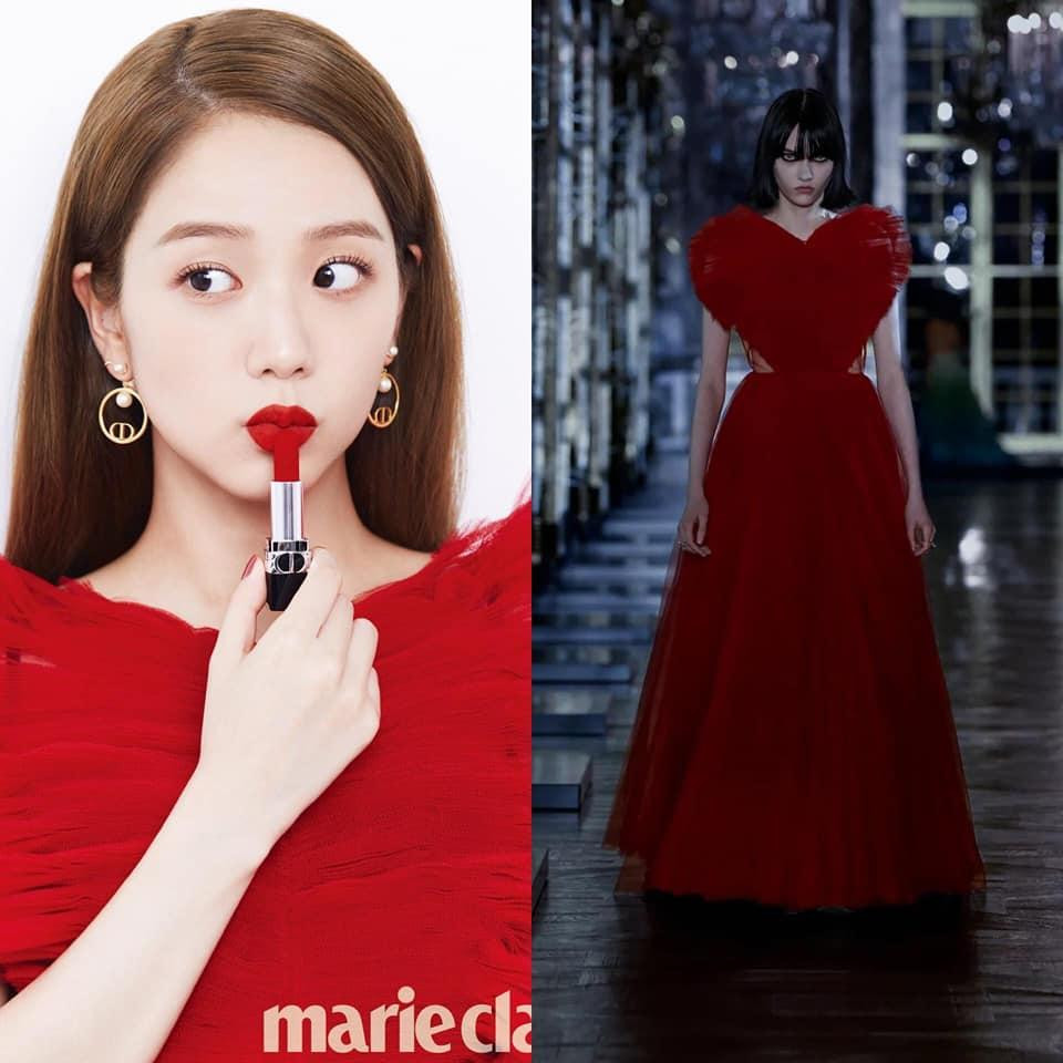 Jisoo hiếm khi thoa son đỏ rực rỡ đến vậy, cộng thêm bộ váy voan bồng bềnh đỏ thắm đã biến cô thành một đóa hồng vô cùng lộng lẫy.