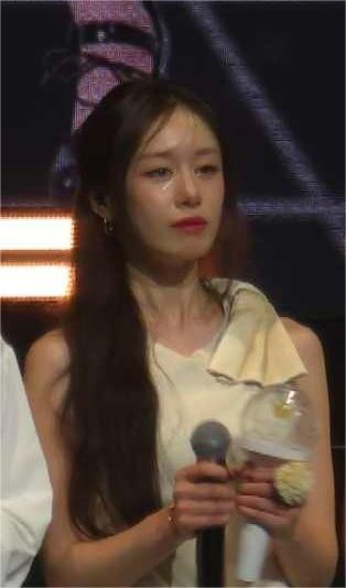 | Trước những lời cổ vũ và động viên bên dưới khán đài, Jiyeon liên tục nói lời cảm ơn người hâm mộ. Dù luôn cố gắng giữ nụ cười tươi tắn nhưng ánh mắt của cô không giấu nổi sự mệt mỏi và buồn bã. |