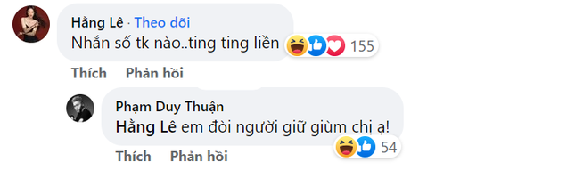 Bên dưới bài viết của Jun Phạm, Minh Hằng nhanh chóng có mặt thể hiện sự hào phóng của mình với người em thân thiết. Cụ thể, nữ diễn viên kêu Jun Phạm nhắn số tài khoản để chuyển khoản bù nếu như không tìm được người giữ phong bì. Tuy nhiên, Jun Phạm nhanh chóng từ chối và cho biết anh chỉ đòi người giữ giùm mà thôi.
