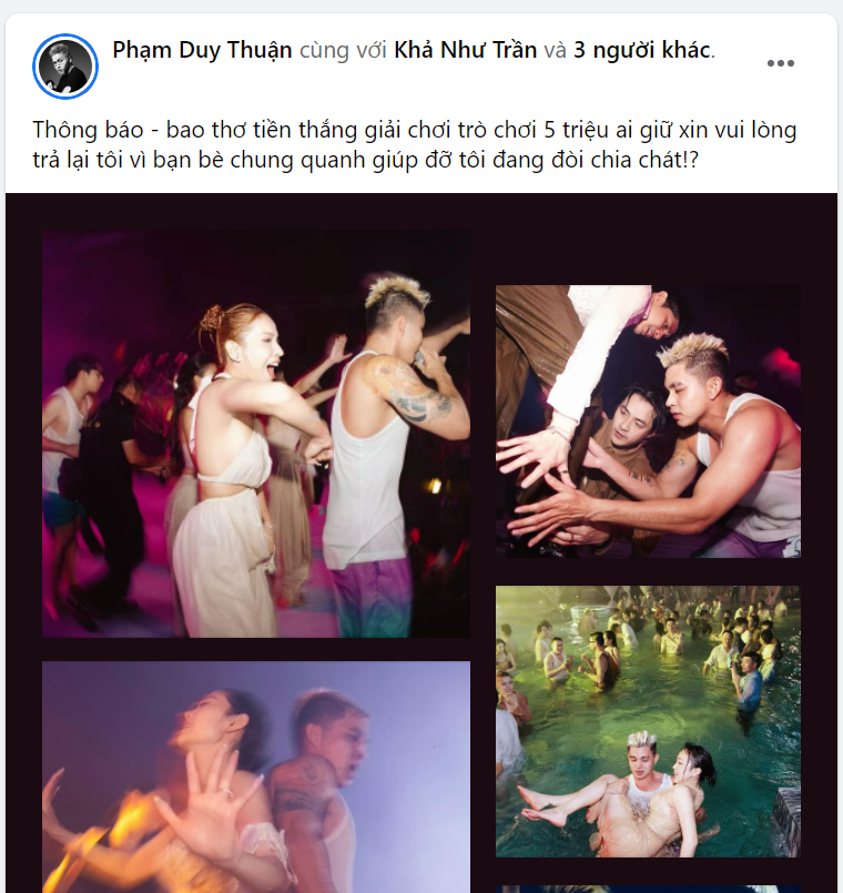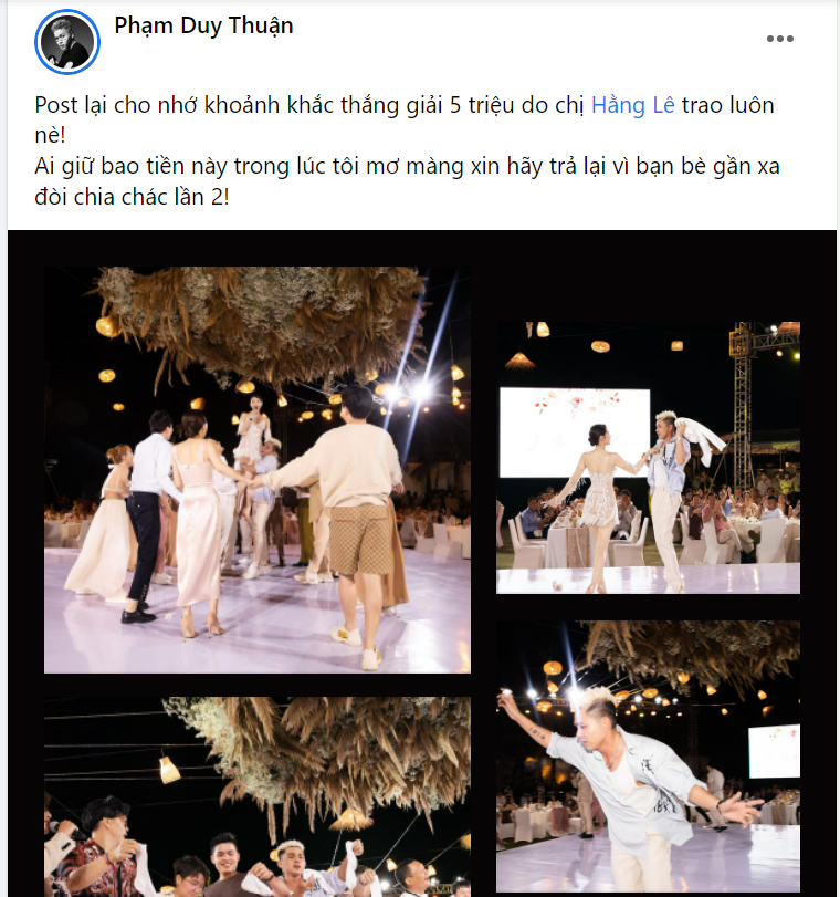 Trước đó, nam ca sĩ cũng từng đăng tải bài viết tìm người giữ hộ phong bì 5 triệu thắng giải nhưng đến giờ vẫn chưa tìm được người cầm hộ. Nam ca sĩ cũng đùa vui rằng vì bạn bè đang đòi chia giải thưởng nên phải tìm gấp.