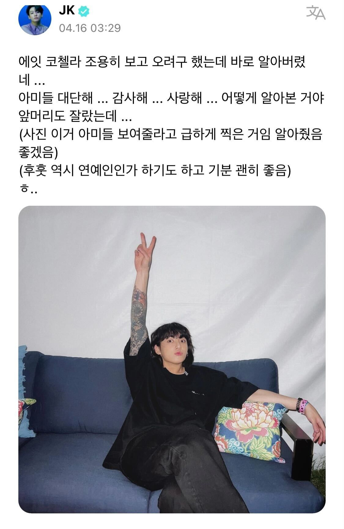 “Mình chỉ định đi xem Coachella một cách lặng lẽ thôi mà mọi người vẫn nhận ra mình. ARMY đỉnh thật đó, mình rất biết ơn vì điều này và mình yêu các bạn nhiều... Sao mọi người nhận ra mình được vậy nhỉ? Thậm chí mình đã cắt tóc mái rồi nữa. Ảnh này mình chụp vội này để dành cho ARMY. Nhưng cảm giác này thật sự là cảm giác làm người nổi tiếng đó... Thích thật nha", Jung Kook chia sẻ. Diện mạo mới toanh có phần đáng yêu của Jung Kook khiến người hâm mộ không khỏi liên tưởng đến nhân vật hoạt hình nổi tiếng Kiki (Kiki's Delivery Service).