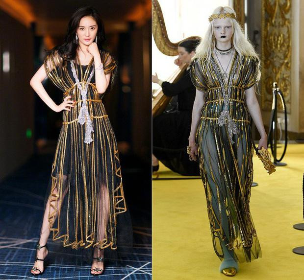 Nếu gặp váy xuyên thấu thì sao? Dương Mịch sẽ mặc thêm một lớp váy lót hai dây bên trong. Màn biến tấu này của cô thậm chí còn được khen là đẹp hơn bản gốc, giúp những đường lấp lánh nổi bật hơn trên nền đen.