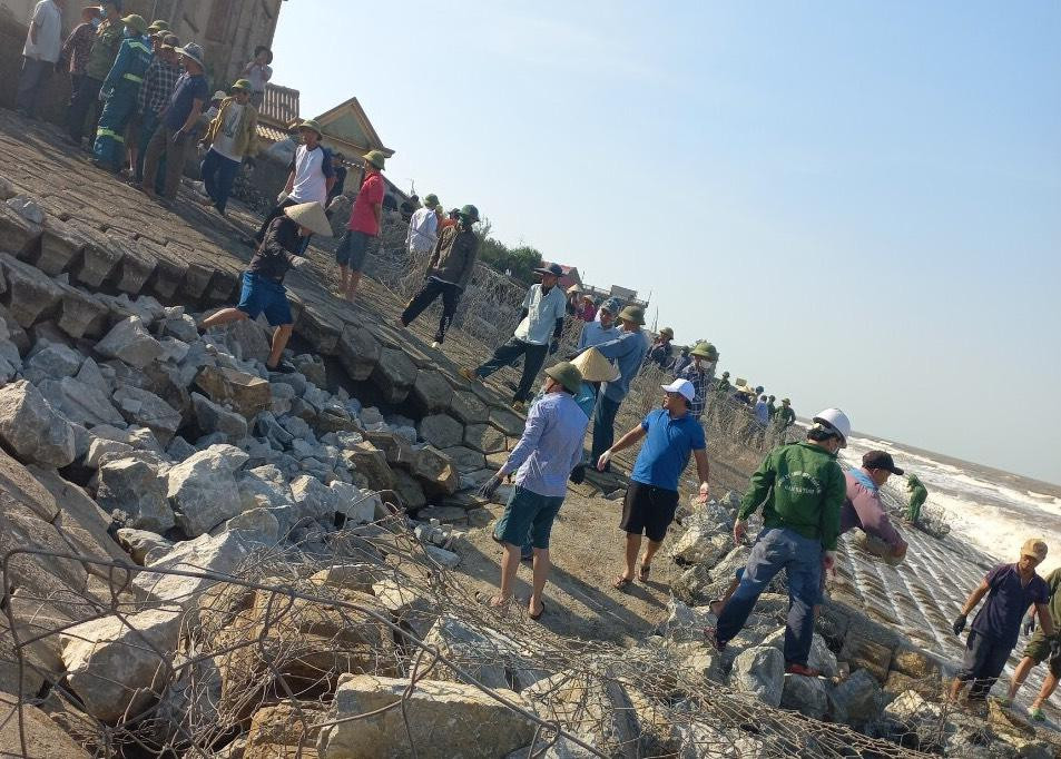 | Hàng trăm người được huy động để gia cố kè biển. |