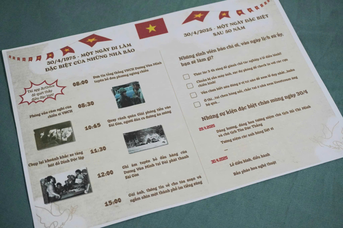 Ấn phẩm có hai mặt thông tin. Mặt trước giới thiệu các tuyến đường tại TP. HCM mang tên nhà báo cách mạng, cho phép người đọc quét mã QR để truy cập tiểu sử. Mặt sau tái hiện lịch trình tác nghiệp của phóng viên trong ngày 30/4/1975 dựa trên tư liệu từ cả phóng viên Việt Nam và nước ngoài. Người xem sẽ sử dụng ứng dụng Artivive để quét ảnh, từ đó hiển thị video về sự kiện lịch sử này. Ngoài ra, nhóm còn khảo sát ý kiến sinh viên Báo chí về việc họ sẽ làm trong ngày 30/4/2025 – thời điểm tròn 50 năm Ngày Giải phóng miền Nam, thống nhất đất nước. Thành viên Như Ý cho biết, đây là cách nhóm kết nối giữa quá khứ và hiện tại, nêu lên vai trò của người làm báo trẻ trong bối cảnh hôm nay.