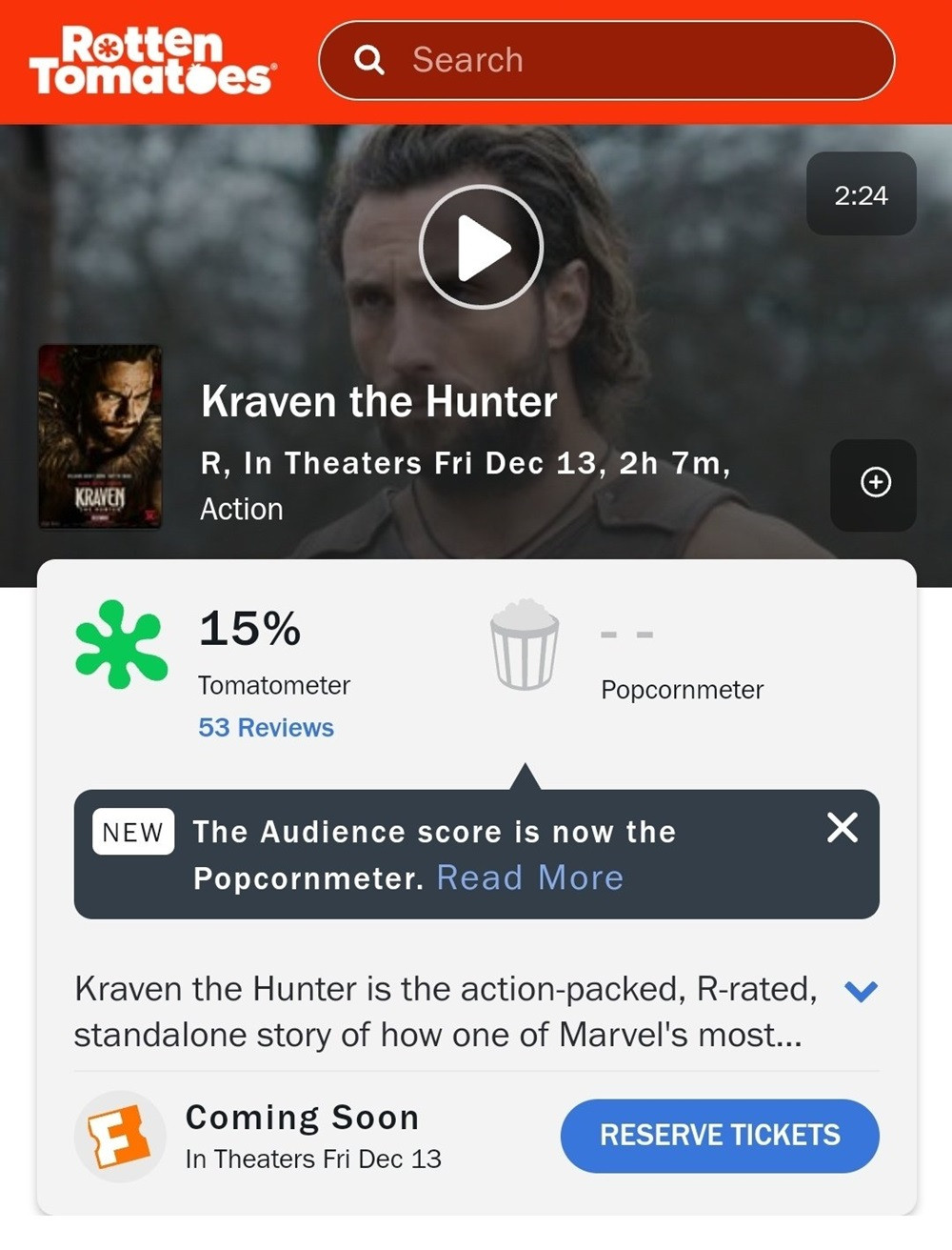 Kraven The Hunter đã không thoát được “số phận” nhận “cà chua thối” như phần nhiều các phim khác nằm trong Vũ trụ Người Nhện của Sony. Chất lượng phim tệ đến mức nó chỉ nhận được đánh giá 15% từ phía các nhà phê bình trên trang Rotten Tomatoes, số điểm tỏ rõ quan điểm phim không đáng xem.