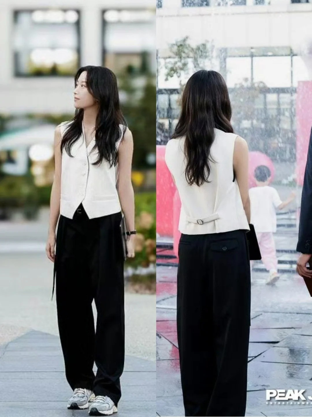 Baek Su Jeong yêu thích các mẫu áo ghi-lê trong trang phục công sở. Mỹ nhân xứ Hàn khéo léo tạo điểm nhấn với phụ kiện đồng hồ dây mảnh hay các chi tiết cách điệu trên trang phục như cúc vàng ánh kim hay vạt chéo bất đối xứng.