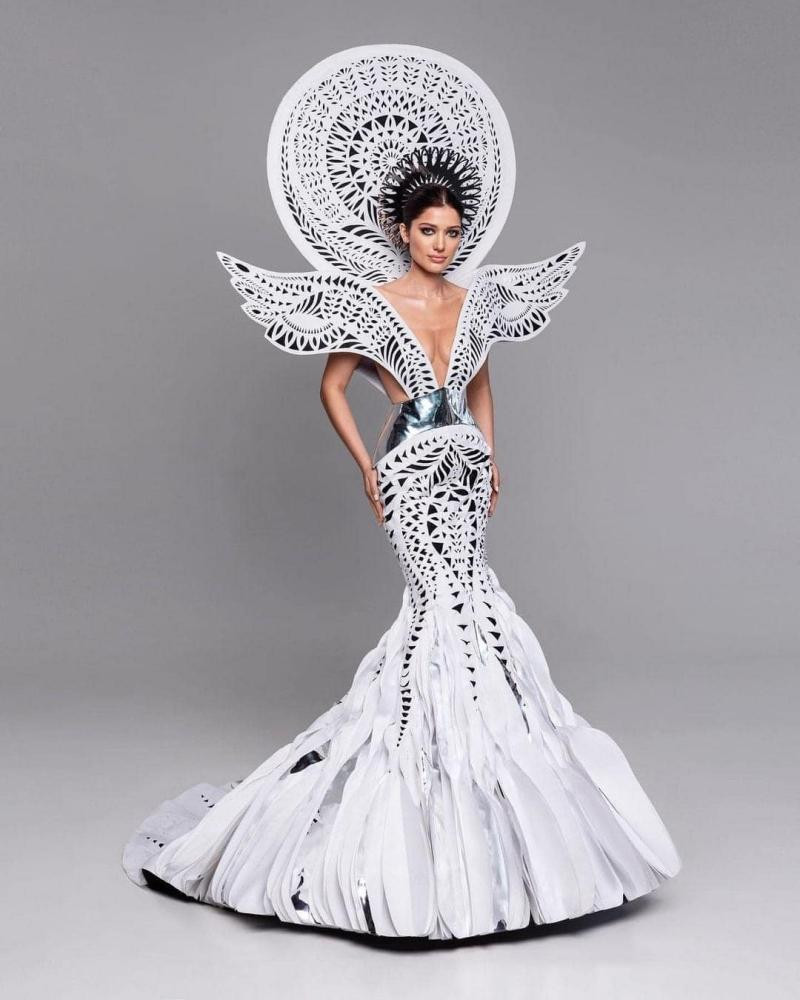 Thêm một bộ trang phục mang sắc trắng nhận được rất nhiều lời khen, đó là trang phục dân tộc đến từ Hoa hậu Ukraina. Chiếc váy lấy cảm hứng từ nghệ thuật cắt giấy, được thiết kế như một mẫu váy dạ hội đẹp mắt, giúp Hoa hậu Ukraina xuất hiện đẹp như một nữ thần.