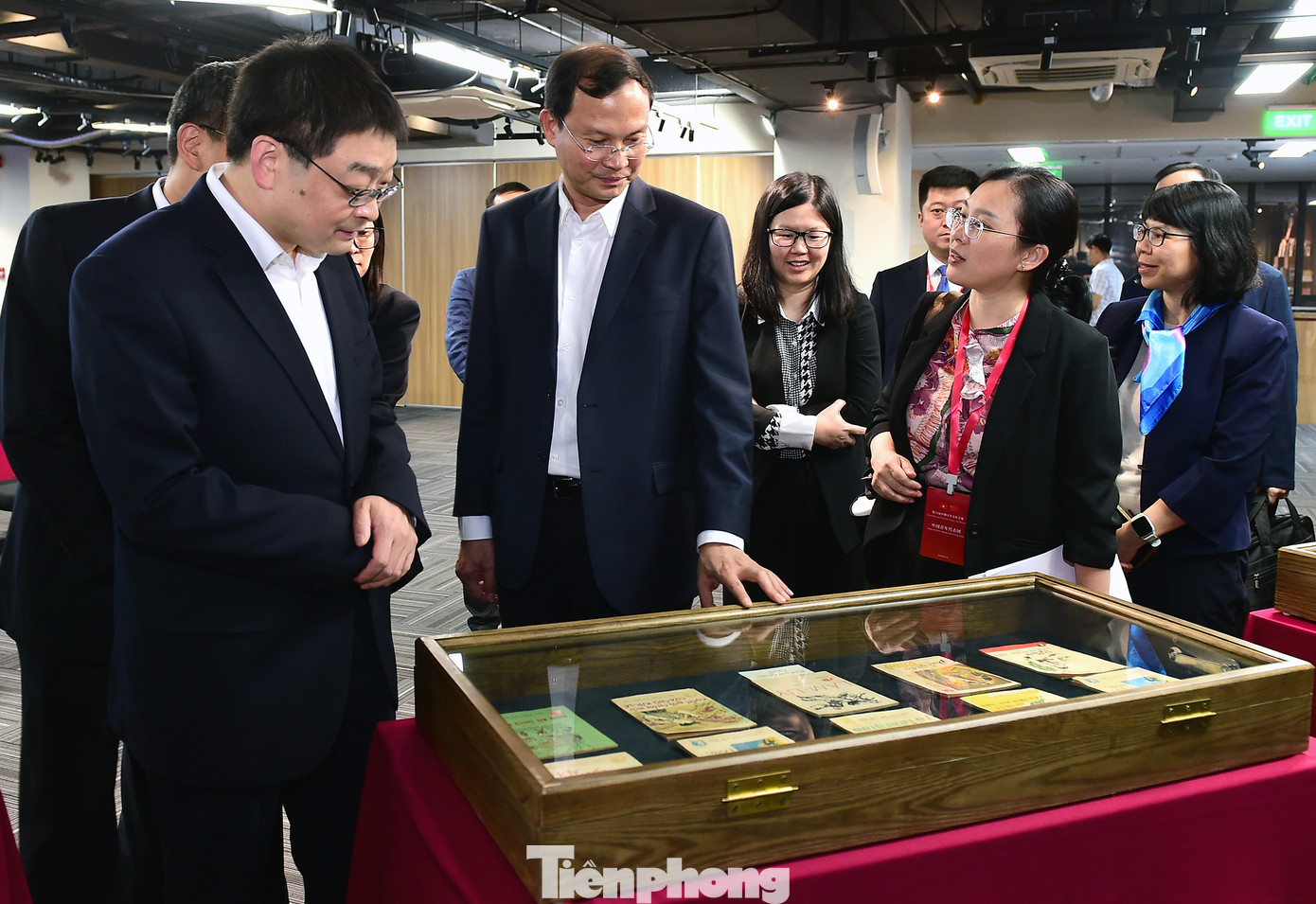| Cùng với việc trao đổi, chia sẻ thông tin, đoàn đại biểu T.Ư Đoàn TNCS Trung Quốc đã tham quan và được giới thiệu một số ấn phẩm tiêu biểu gắn với quá trình phát triển của nhà xuất bản mang tên người anh hùng Kim Đồng (bí danh của Nông Văn Dền - một thiếu niên người dân tộc Nùng, ở xóm Nà Mạ, xã Trường Hà, huyện Hà Quảng, tỉnh Cao Bằng). Trong ảnh, anh Bùi Tuấn Nghĩa giới thiệu cho đoàn. |