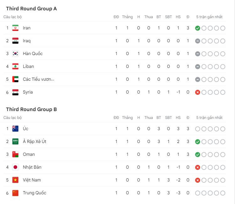 Bảng xếp hạng vòng loại thứ 3 World Cup khu vực châu Á