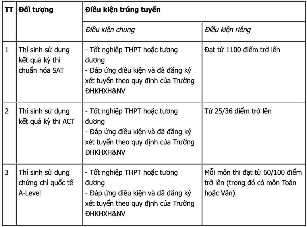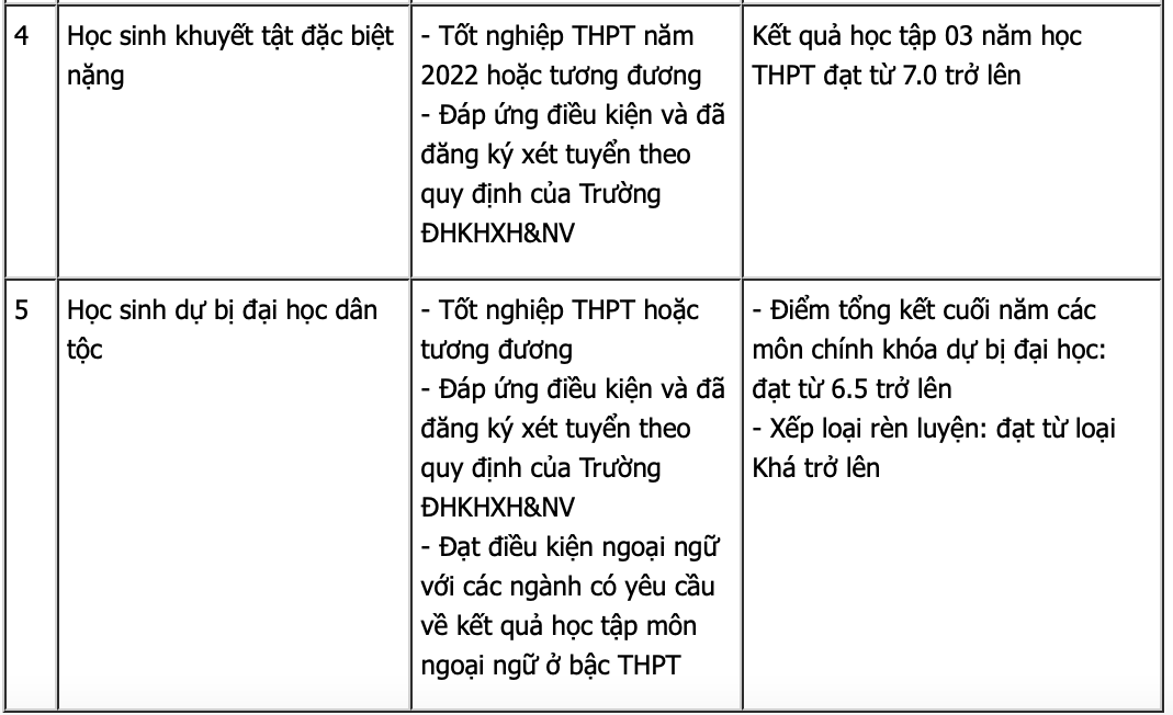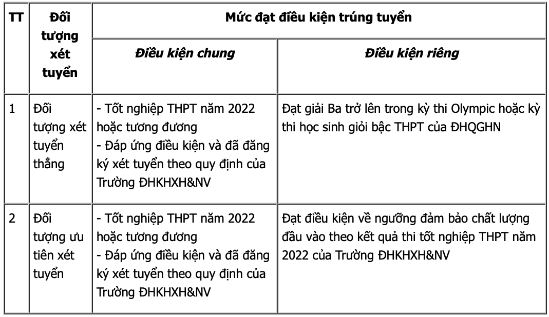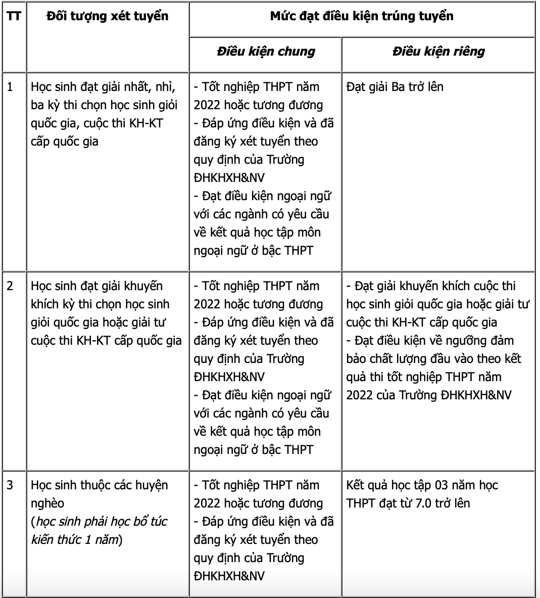 - Đáp ứng điều kiện (điểm ngoại ngữ, điểm thi tổ hợp 2 môn tốt nghiệp THPT năm 2022) và đã đăng ký xét tuyển theo quy định của Trường ĐHKHXH&NV.