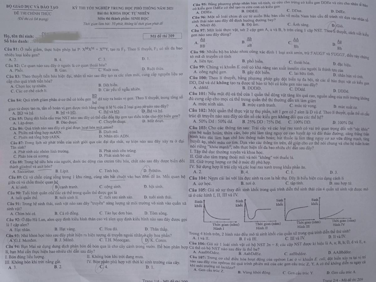 Đề thi môn Sinh học, bài thi tổ hợp Khoa học tự nhiên.