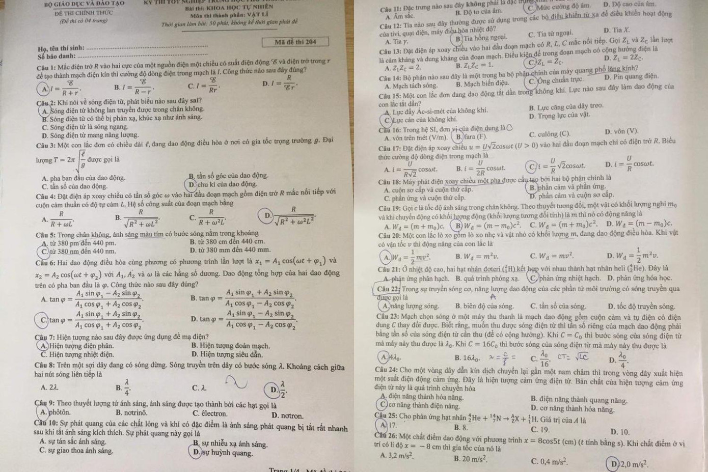 Đề thi môn Vật lý, bài thi tổ hợp Khoa học tự nhiên.