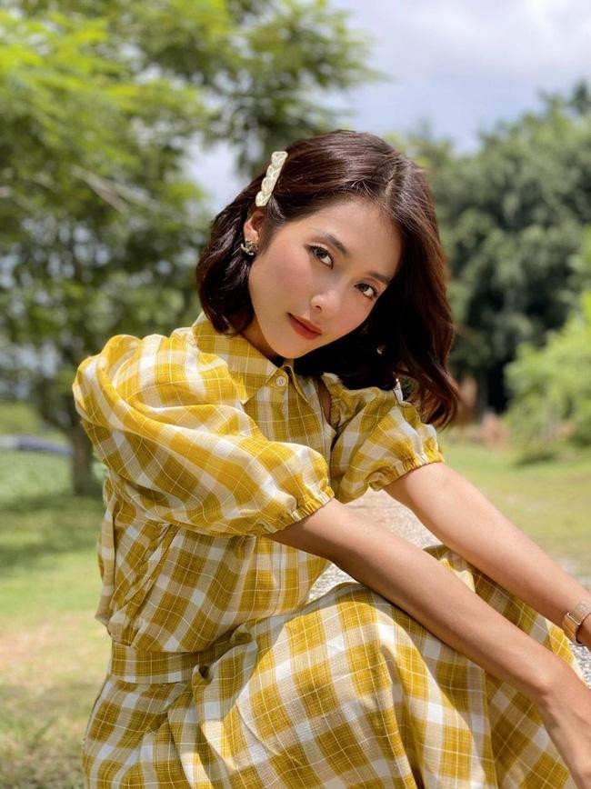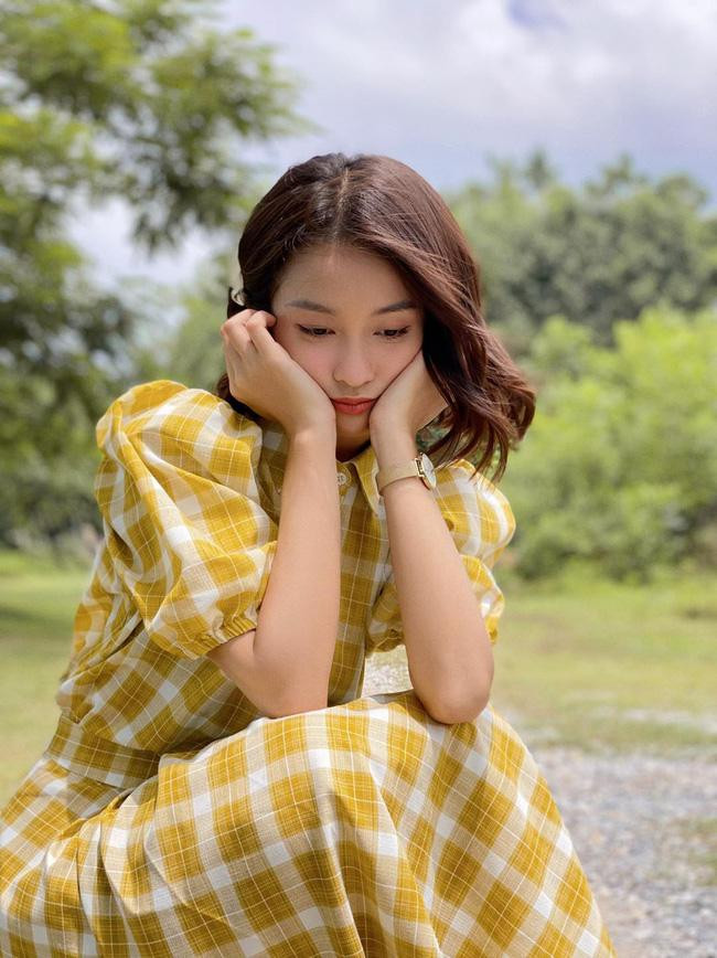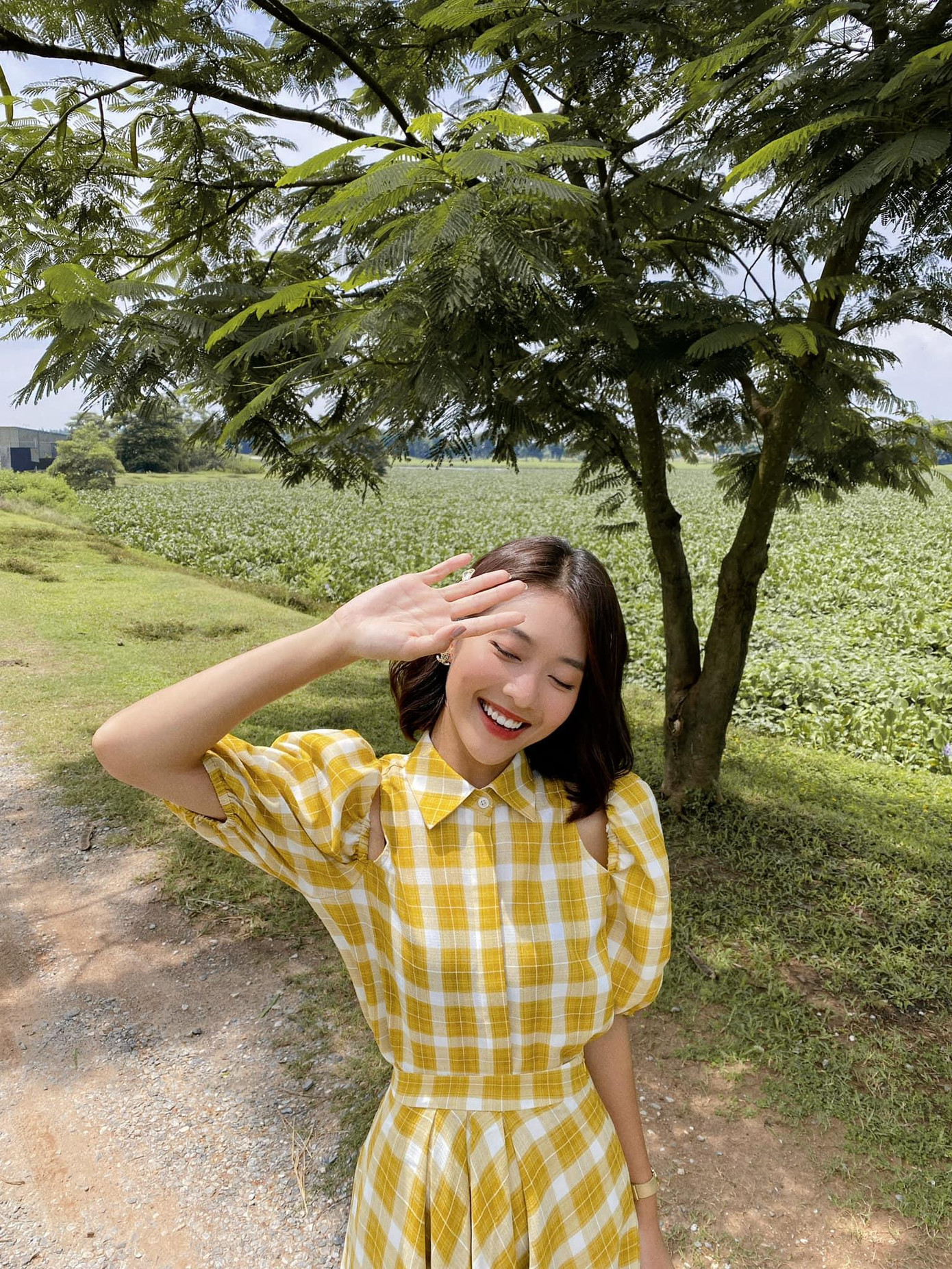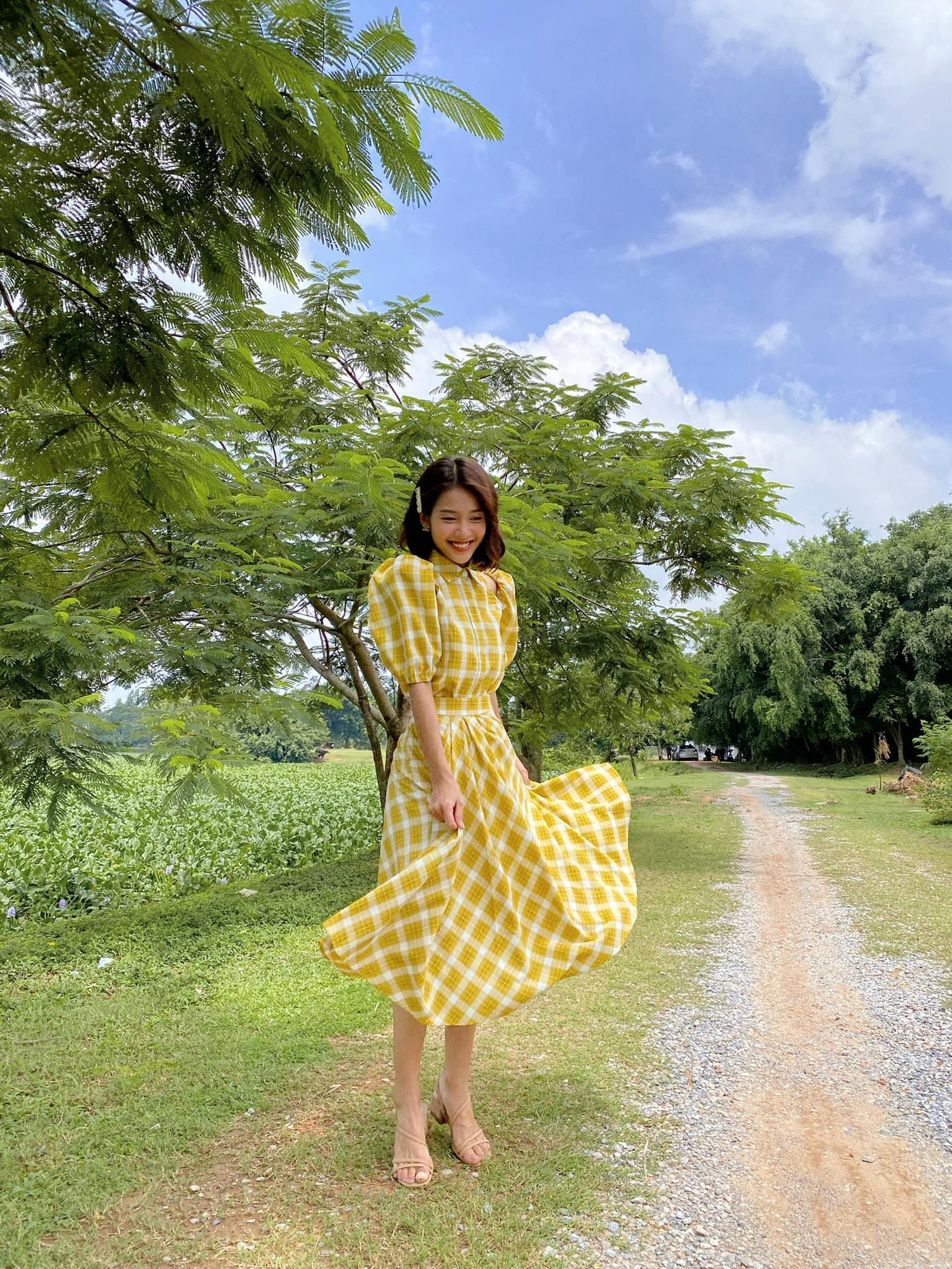 Nhưng mới đây, Khả Ngân lại khoe ảnh mới trên phim trường 11 Tháng 5 Ngày. Cô nàng vô cùng rực rỡ với chiếc váy midi (kiểu chân váy dài đến bắp chân) thân xòe rộng có họa tiết kẻ caro vàng, trắng nổi bật.