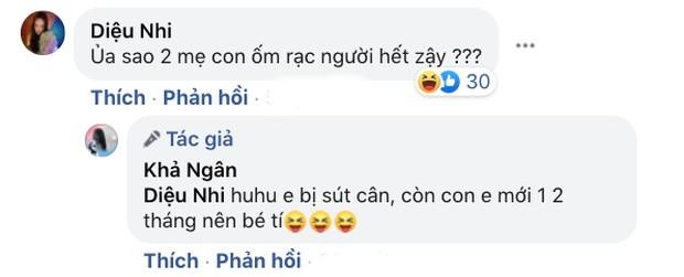Đến Diệu Nhi cũng bất ngờ với hình ảnh mới của Khả Ngân: "Ủa sao 2 mẹ con ốm rạc người hết vậy?", cô viết. Diễn viên Lê Phương cũng đồng quan điểm: "Ốm quá Út ơi, bồi bổ lại đi cưng". Đáp lại sự quan tâm của các đồng nghiệp, diễn viên 11 Tháng 5 Ngày cho biết đang bị sút cân, dù đã cố ăn nhiều nhưng vẫn chưa thể tăng cân trở lại.