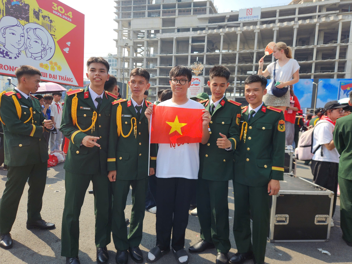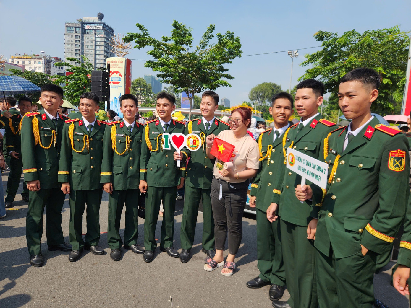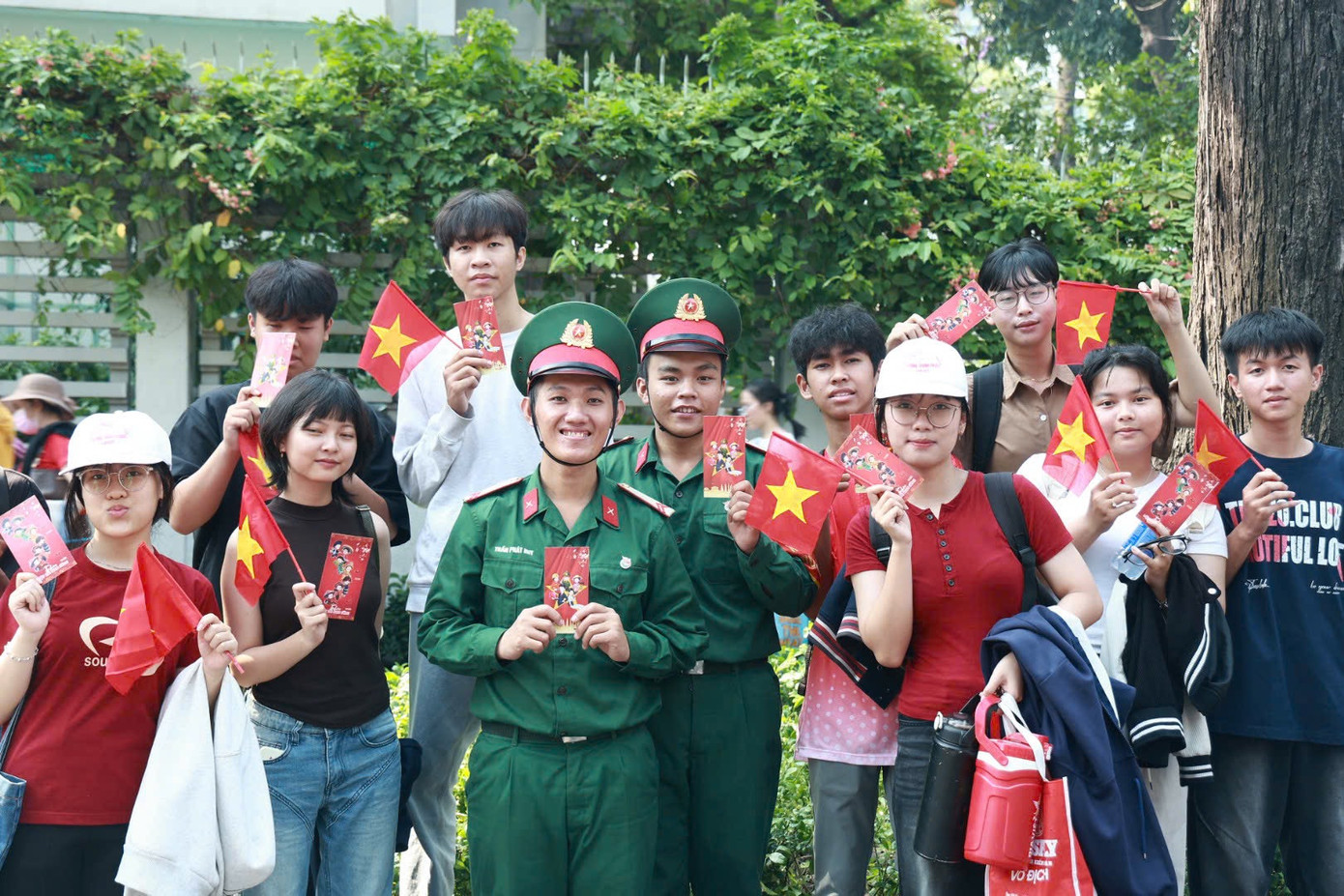 Du khách Tây đội nón tai bèo, cầm cờ đỏ sao vàng, quấn khăn rằn và băng đô khẩu hiệu Tôi yêu Việt Nam chụp ảnh cùng sĩ quan Lục quân.