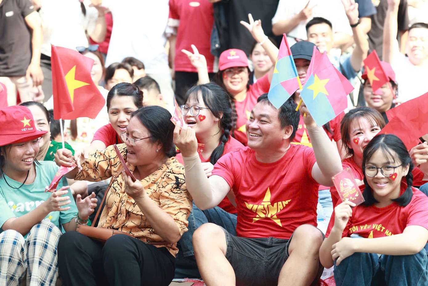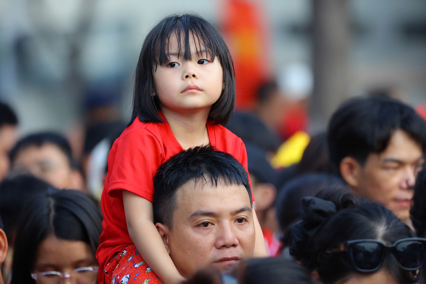 Những em bé được bố mẹ cõng trên lưng, hòa vào không khí đông đúc và đầy tự hào giữa biển người khu vực đường Lê Duẩn, hướng ra trục Lê Lợi - Nam Kỳ Khởi Nghĩa.