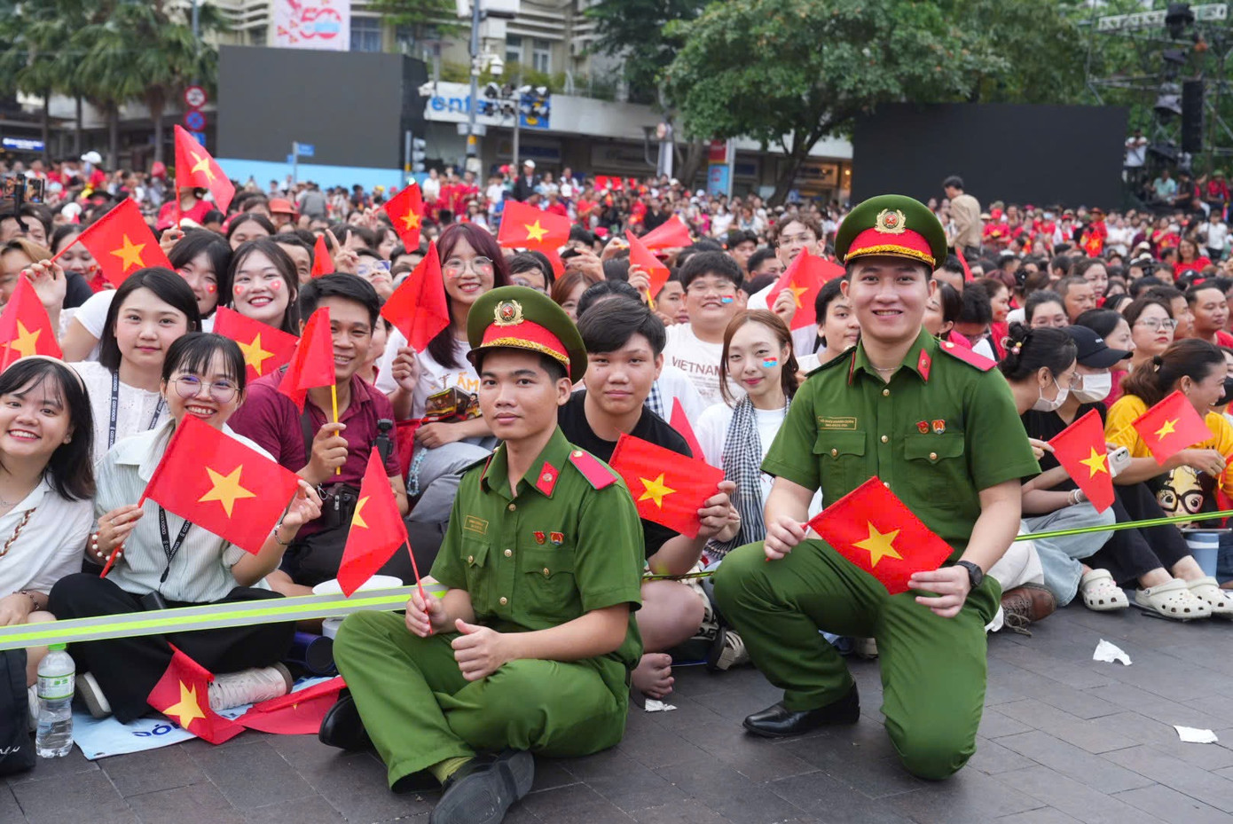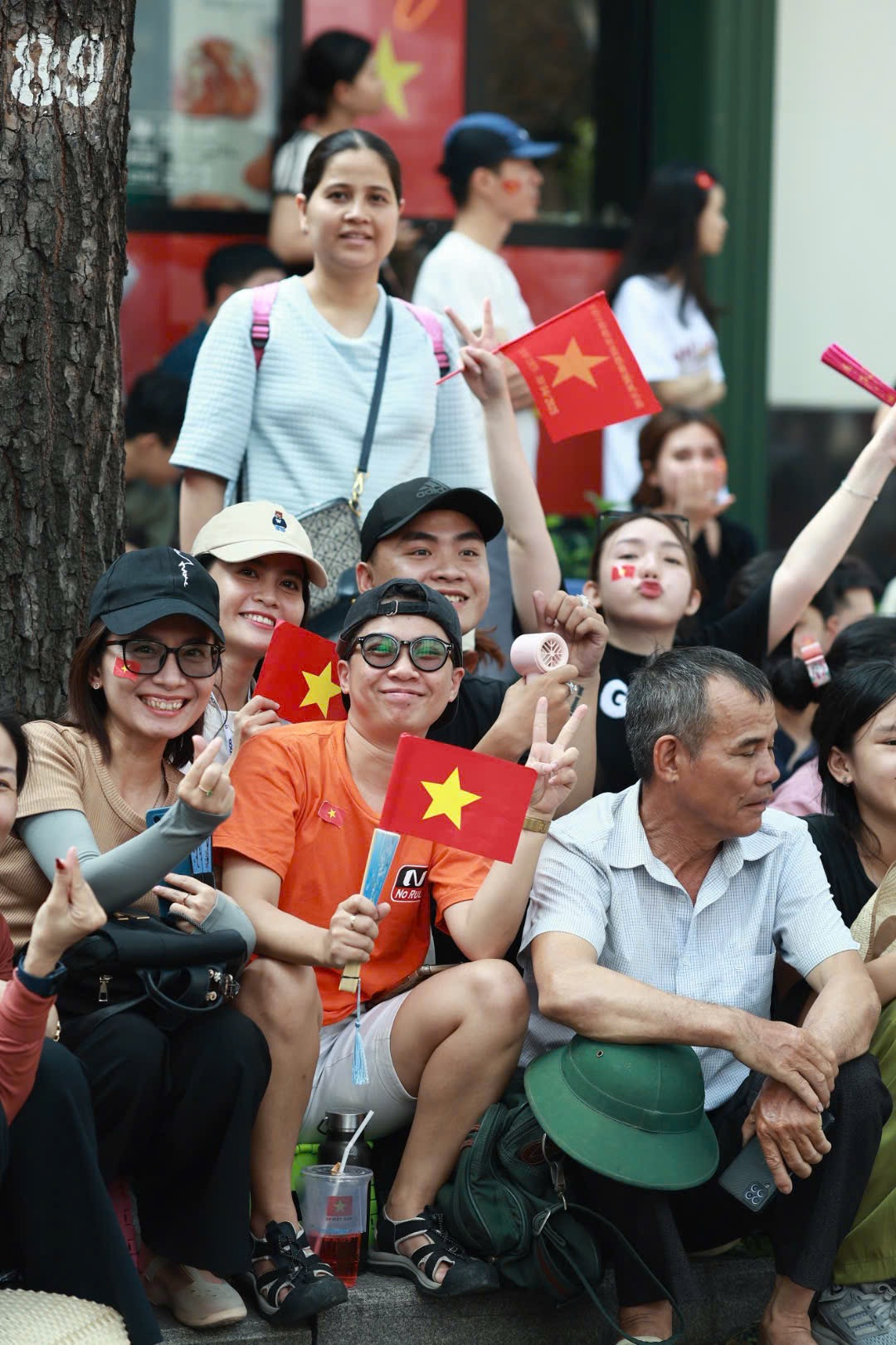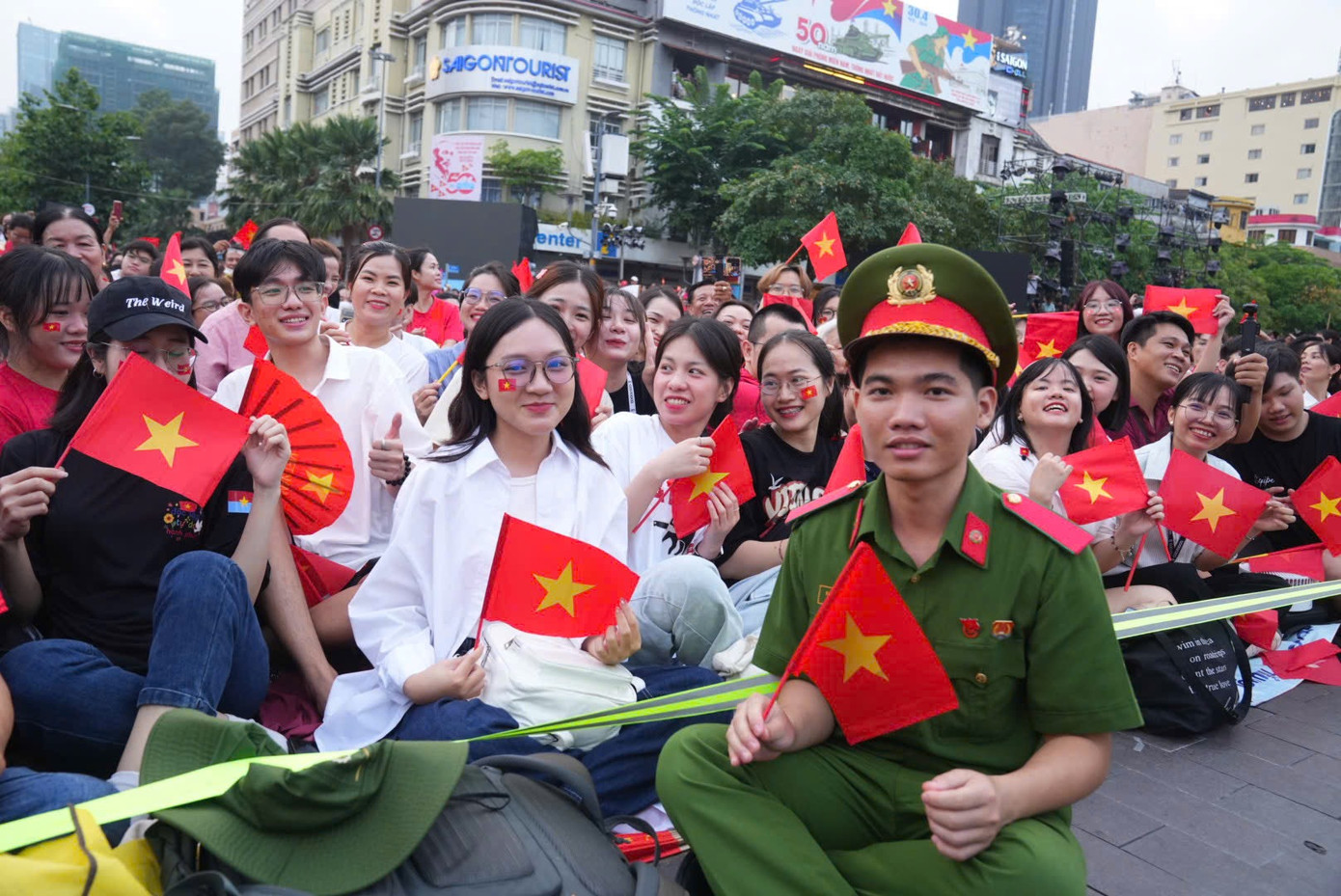 Khu vực trung tâm quận 1, TPHCM ngập sắc đỏ. Người dân ngồi chỉnh tề, liên tục reo hò khi đoàn diễu binh, diễu hành đi qua.