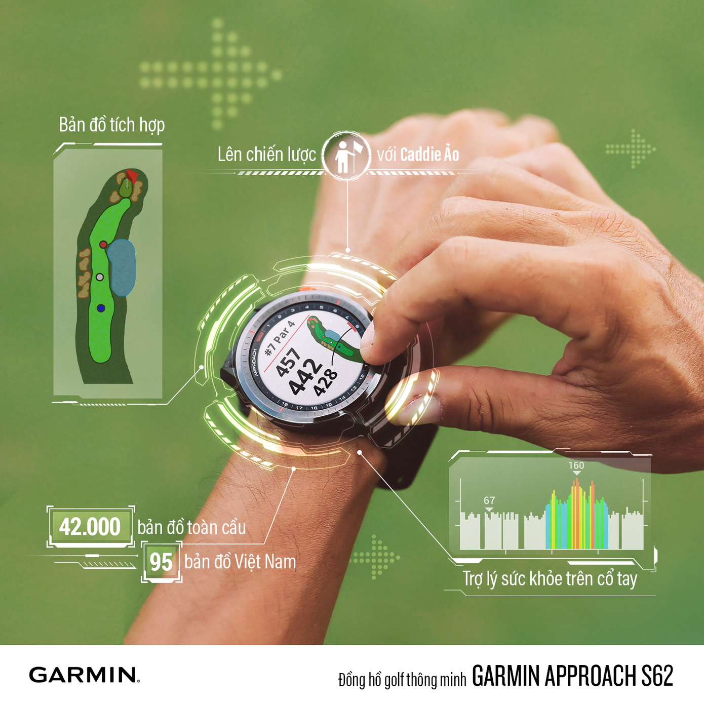 Được tích hợp hơn 42,000 bản đồ toàn cầu và 95 bản đồ sân golf tại Việt Nam, đồng hồ Garmin Approach S62 giúp golfers dễ dàng hoạch định chiến lược đánh, hiển thị tốc độ và hướng gió, đo khoảng cách đánh bóng với tính năng Autoshot và đặc biệt tính năng Caddie ảo, đề xuất gậy đánh phù hợp với từng hố dựa trên dữ liệu quá khứ của người sử dụng. Máy đo khoảng cách Garmin Approach Z82 cũng chứa sẵn 42,000 bản đồ Golf và trang bị màn hình điện tử với GPS tích hợp, bản đồ 2D màu sắc trực quan. Một số trợ thủ đáng chú ý nữa có thể kể đến cảm biến đánh golf cầm tay Garmin Approach G80 dùng được ở sân golf lẫn sân tập, hay cảm biến đầu gậy Garmin Approach CT10 tự động thu thập nhiều dữ liệu hơn trong từng cú đánh của mỗi gậy golf, kể cả gậy putt.