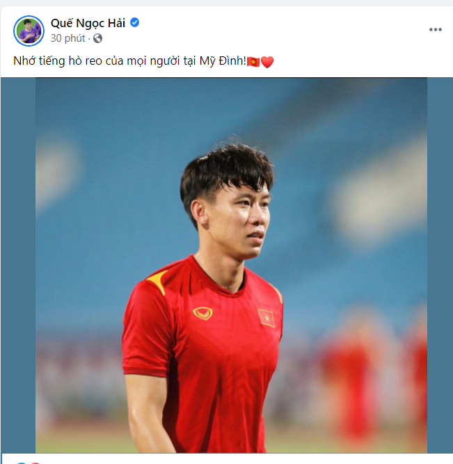 Trên trang cá nhân, nam cầu thủ đăng hình thi đấu cùng dòng chia sẻ: “Nhớ tiếng hò reo của mọi người tại Mỹ Đình”. Sau 10 phút chia sẻ, bài đăng của cầu thủ thu hút gần 40.000 lượt yêu thích của khán giả.