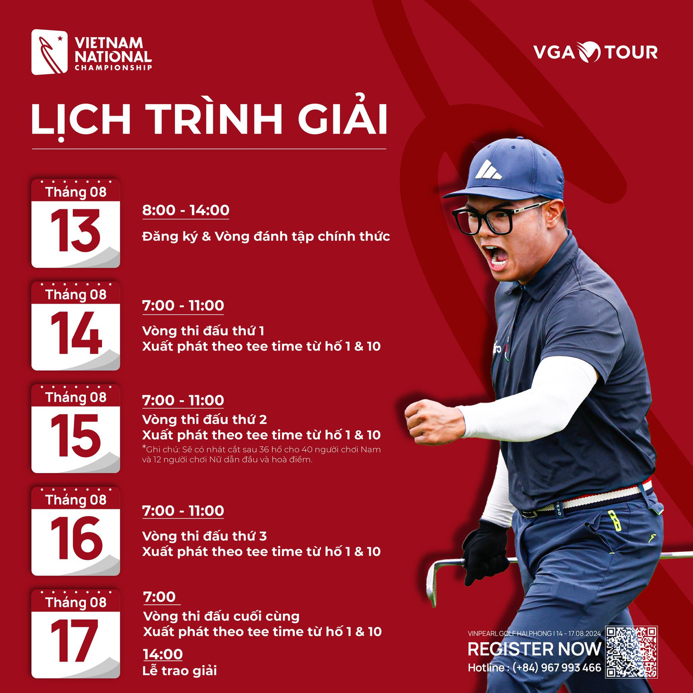 Giải Vô địch Golf Quốc gia 2024, Cúp VinFast - Hải Phòng quy tụ 150 golfer (120 nam và 30 nữ) so tài qua 4 vòng đấu 18 hố (tổng 72 hố). Giải đấu có 1 ngày đánh tập (13/8) và 4 ngày thi đấu chính thức (từ 14 - 17/8) diễn ra tại sân Vinpearl Golf Hải Phòng.
