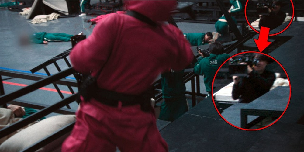 Trong trận giằng co giữa nhóm của Seong Gi Hun và đám lính canh áo hồng, khán giả tinh ý nhận ra có một nhân viên quay phim đang khom người ở một góc để ghi hình. Dù chỉ xuất hiện trong một tích tắc nhưng khoảnh khắc đó đã nhanh chóng gây xôn xao trên mạng xã hội.