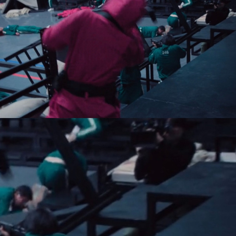 Đây là một trong những cảnh cao trào của tập cuối và cũng là một cảnh quan trọng trong mùa 2 của Squid Game. Lúc này, một cuộc chiến đã nổ ra giữa những người chơi bên trong ký túc xá. Người chơi 456 - Seong Gi Hun (Lee Jung Jae) cùng những người chơi khác muốn chấm dứt trò chơi tàn bạo này một lần và mãi mãi.