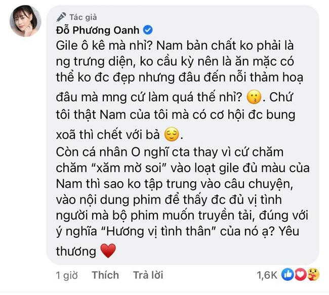 Theo Phương Oanh lý giải thì Nam là kỹ sư điện nước, cần ăn mặc sạch sẽ gọn gàng và cô không hiểu tại sao khán giả lại khắt khe đến vậy. Cuối cùng, Phương Oanh mong người xem ngừng áp đặt ý kiến của mình lên người khác cũng như thôi săm soi chuyện quần áo của Nam mà tập trung thưởng thức nội dung phim.