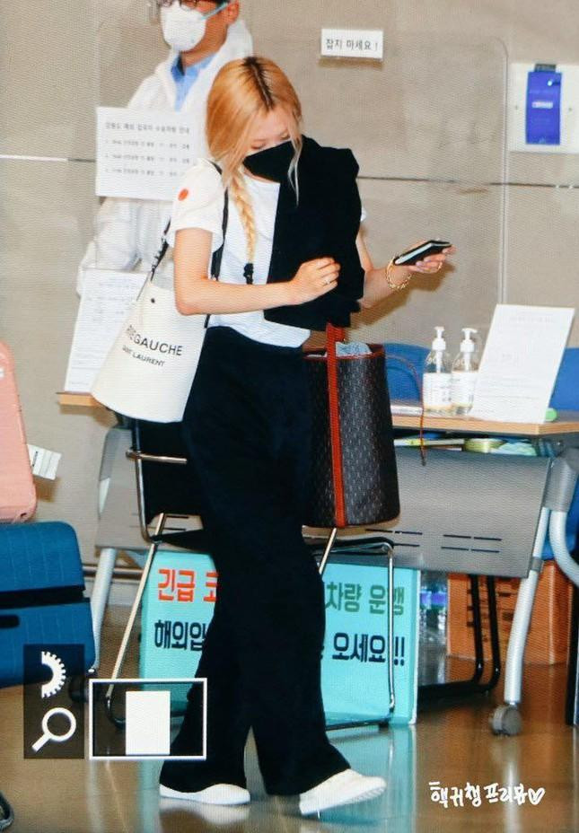 Rosé lại chọn set đồ gồm quần ống rộng, áo thun và giày thể thao kèm theo áo khoác mỏng. Trang phục của Rosé được xem là lựa chọn hoàn hảo khi đi máy bay, đủ đẹp, hợp thời trang mà lại gọn gàng. Nếu thấy lạnh trên máy bay thì đã có áo khoác để giữ ấm.