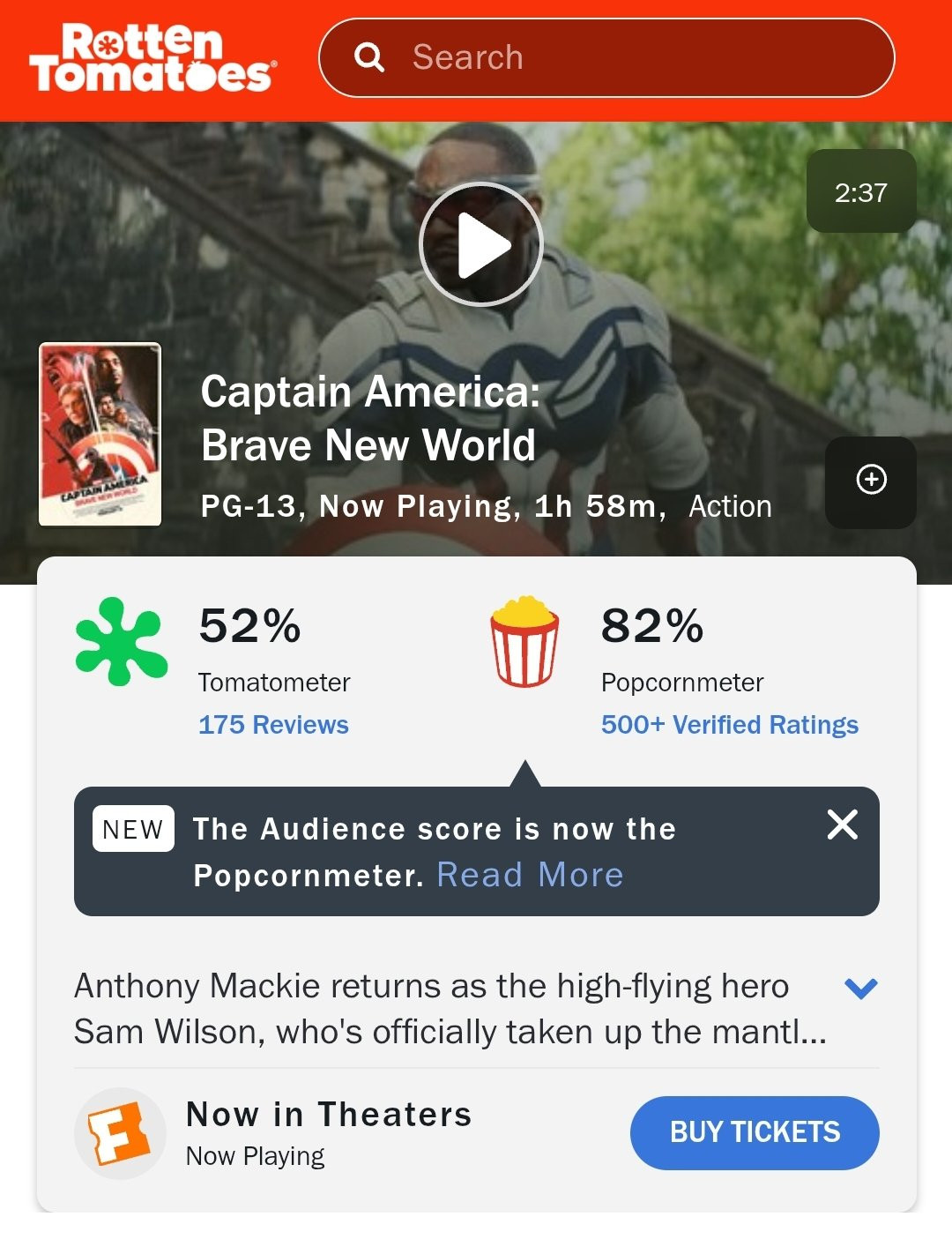 Trên trang Rotten Tomatoes, Captain America: Brave New World chỉ nhận được 52% “độ tươi” từ các nhà phê bình, có nghĩa là chất lượng chỉ trên trung bình một tẹo, còn cách rất xa tiêu chuẩn “thơm ngon” để thưởng thức.