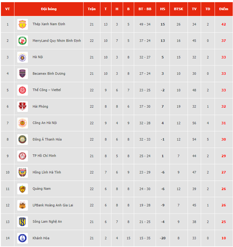 Sau ngày thi đấu đầu tiên của vòng 22, số phận của Khánh Hòa đã sớm được định đoạt. Hôm qua, Hồng Lĩnh Hà Tĩnh gây bất ngờ khi đánh bại nhà đương kim vô địch CLB Công an Hà Nội 1-0 trên sân nhà, qua đó leo lên vị trí thứ 10 với 27 điểm. Trong khi đó, LPBank HAGL cũng giành 1 điểm quý giá trước Thanh Hóa để cân bằng điểm số với Quảng Nam (26 điểm).
