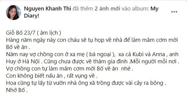 "Giỗ bố 23/7 (âm lịch), hàng năm ngày này con cháu sẽ tụ họp về nhà để làm mâm cơm mời bố về ăn. Năm nay vợ chồng con ở xa mẹ (bà ngoại), xa cả Kubi và Anna, anh Huy ở Hà Nội cũng chưa được về thăm gia đình. Mỗi người mỗi nơi, vợ chồng con tự làm mâm cơm mời bố về ăn nhé. Con không biết nấu ăn, rất vụng về. Hoa cũng tự lấy từ vườn nhà ông xã trồng được vài cây ra bông. Nhớ bố", Kiện tướng dancesport chia sẻ.