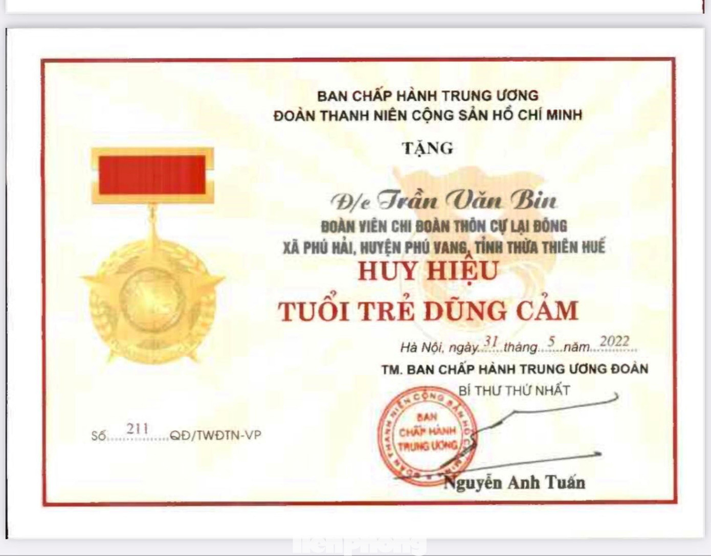 Theo đó, các anh Trần Vĩnh Thu và Trần Văn Bin (cùng là đoàn viên Chi Đoàn thôn Cự Lại Đông, xã Phú Hải, huyện Phú Vang) đã được Ban Thường vụ T.Ư Đoàn quyết định tặng Huy hiệu “Tuổi trẻ dũng cảm” cùng với phần thưởng 1 triệu đồng/cá nhân vì đã có hành động dũng cảm cứu sống các em nhỏ bị đuối nước trên biển.
