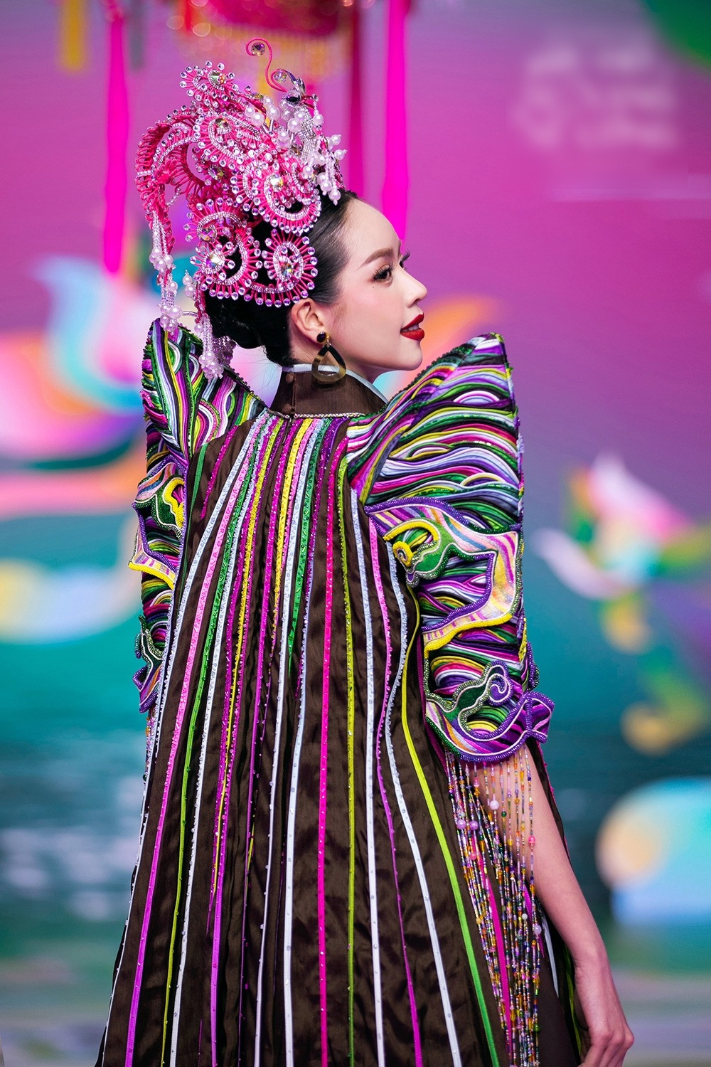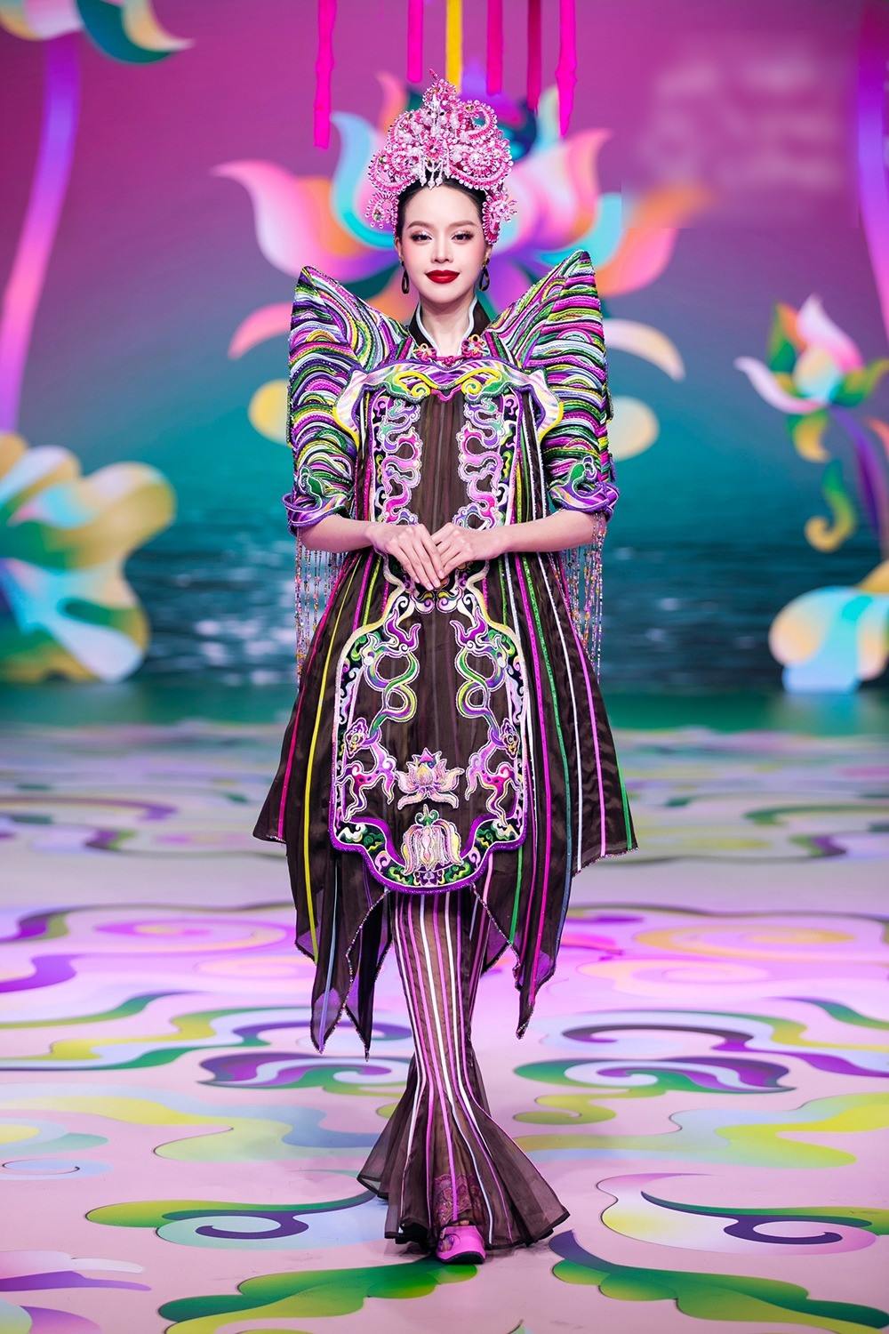 Miss International 2024 còn đảm nhận vị trí vedette trong show thời trang này. Bước ra sân khấu trong một thiết kế có nhiều chi tiết cầu kỳ, Hoa hậu Thanh Thủy vẫn tỏa sáng rực rỡ nhờ gương mặt đẹp không tì vết và những bước đi chuyên nghiệp.